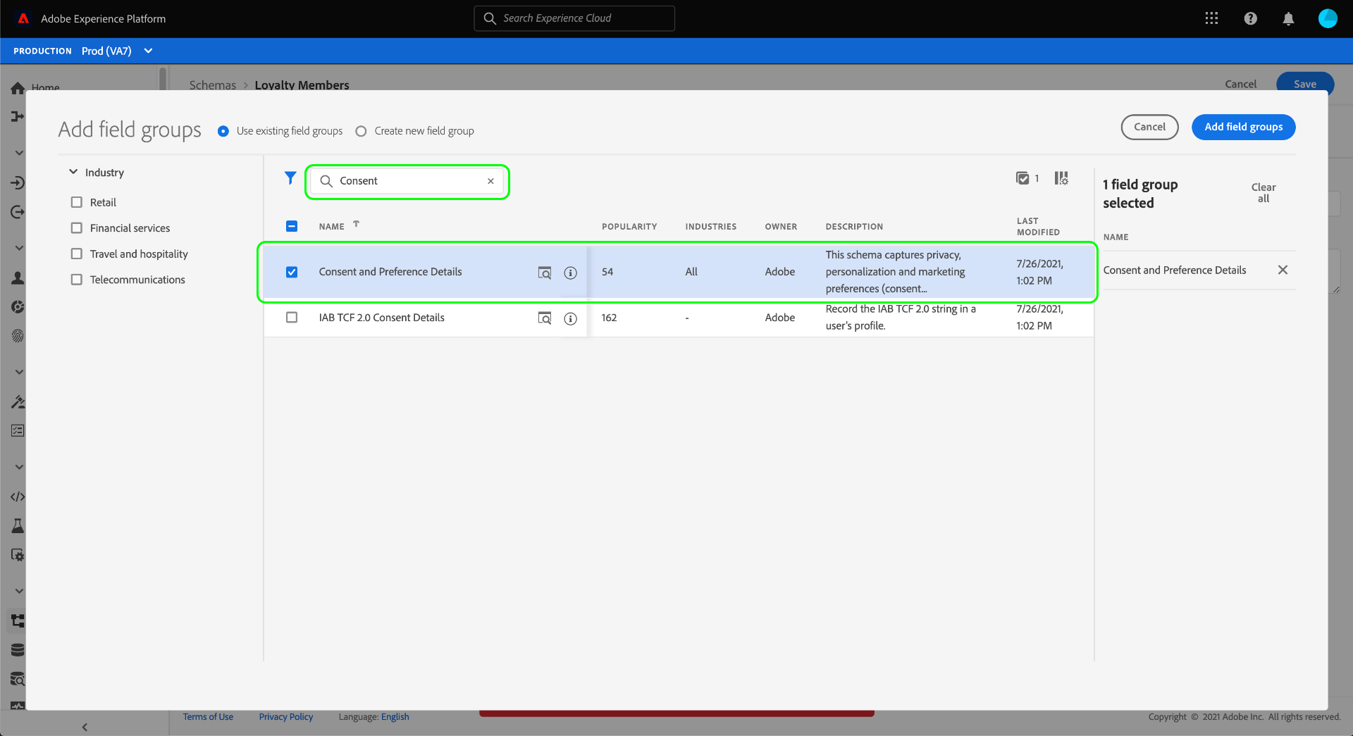 Next, find the IdentityMap field group from the list and select it as well. Once both field groups are listed in the right rail, select Add field groups.
