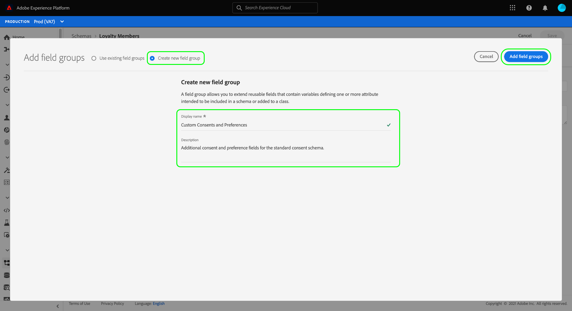 consents, vea la descripción general del grupo de campos Detalles de consentimiento y preferencia.Agregar grupos de campos requeridos al esquema Profile add-field-group