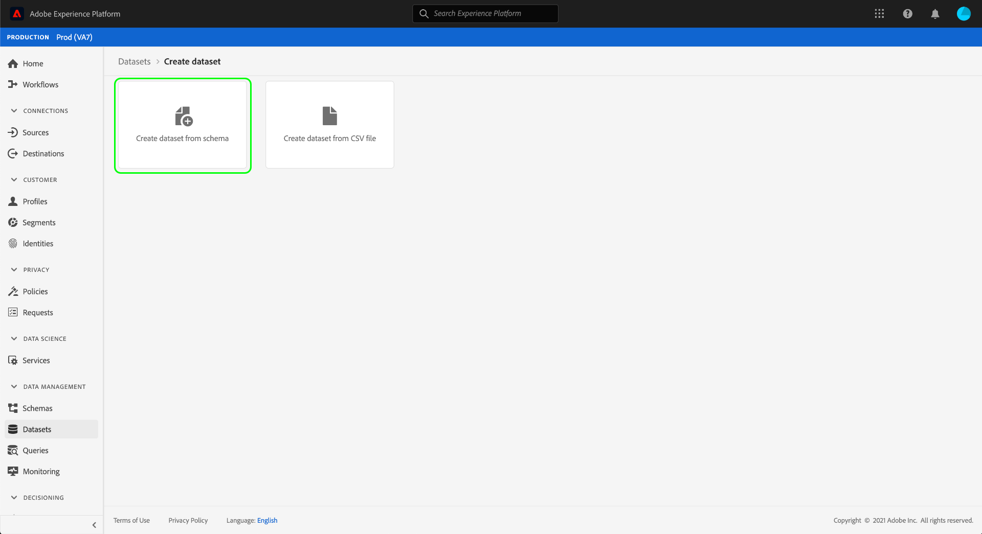 Una vez creado un esquema con campos de consentimiento, debe crear un conjunto de datos que, en última instancia, introduzca los datos de consentimiento de los clientes. Este conjunto de datos debe estar habilitado para Real-Time Customer Profile.