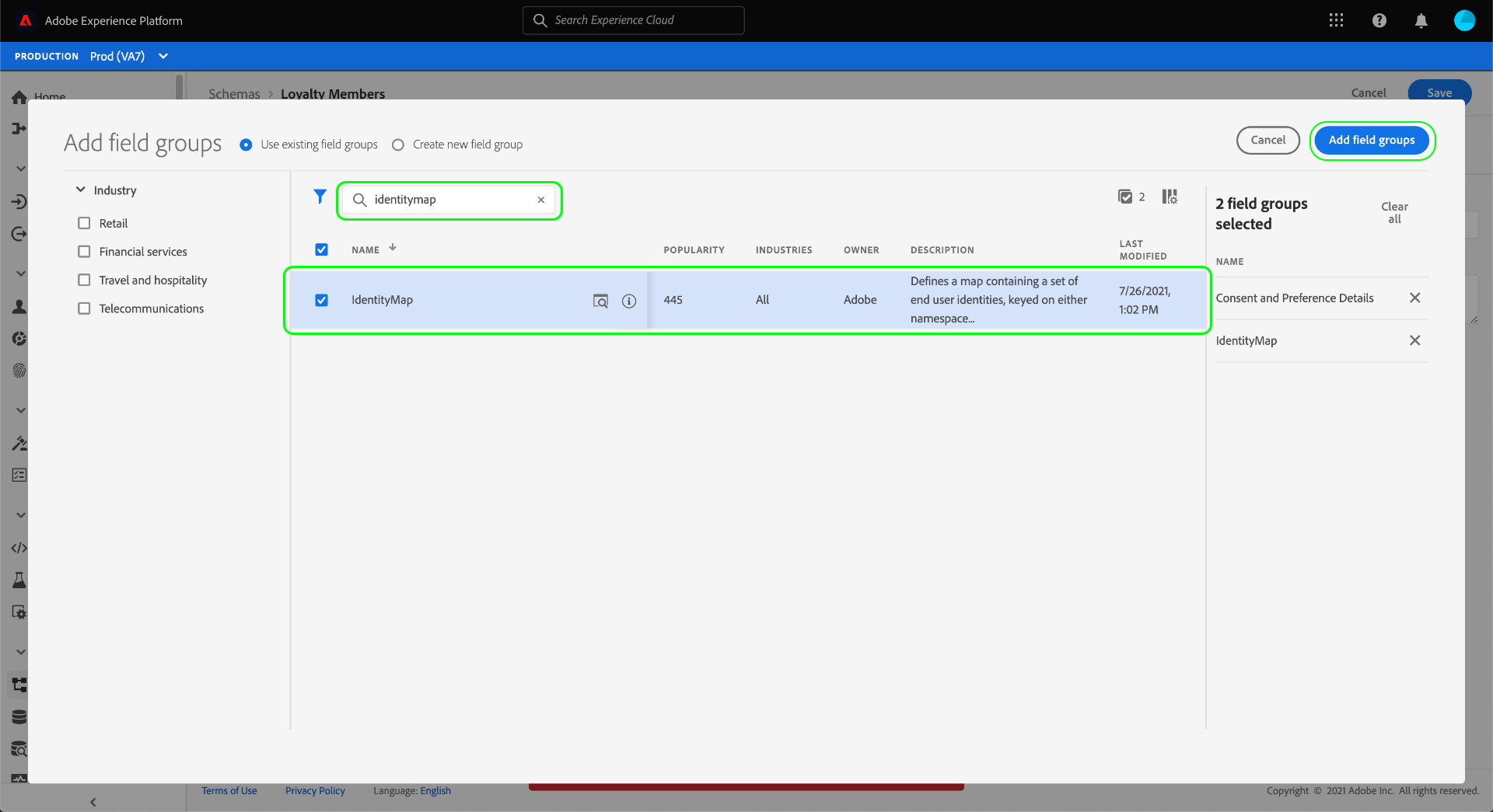 A continuación, busque el grupo de campos IdentityMap en la lista y selecciónelo también. Una vez que ambos grupos de campos estén enumerados en el carril derecho, seleccione Agregar grupos de campos.