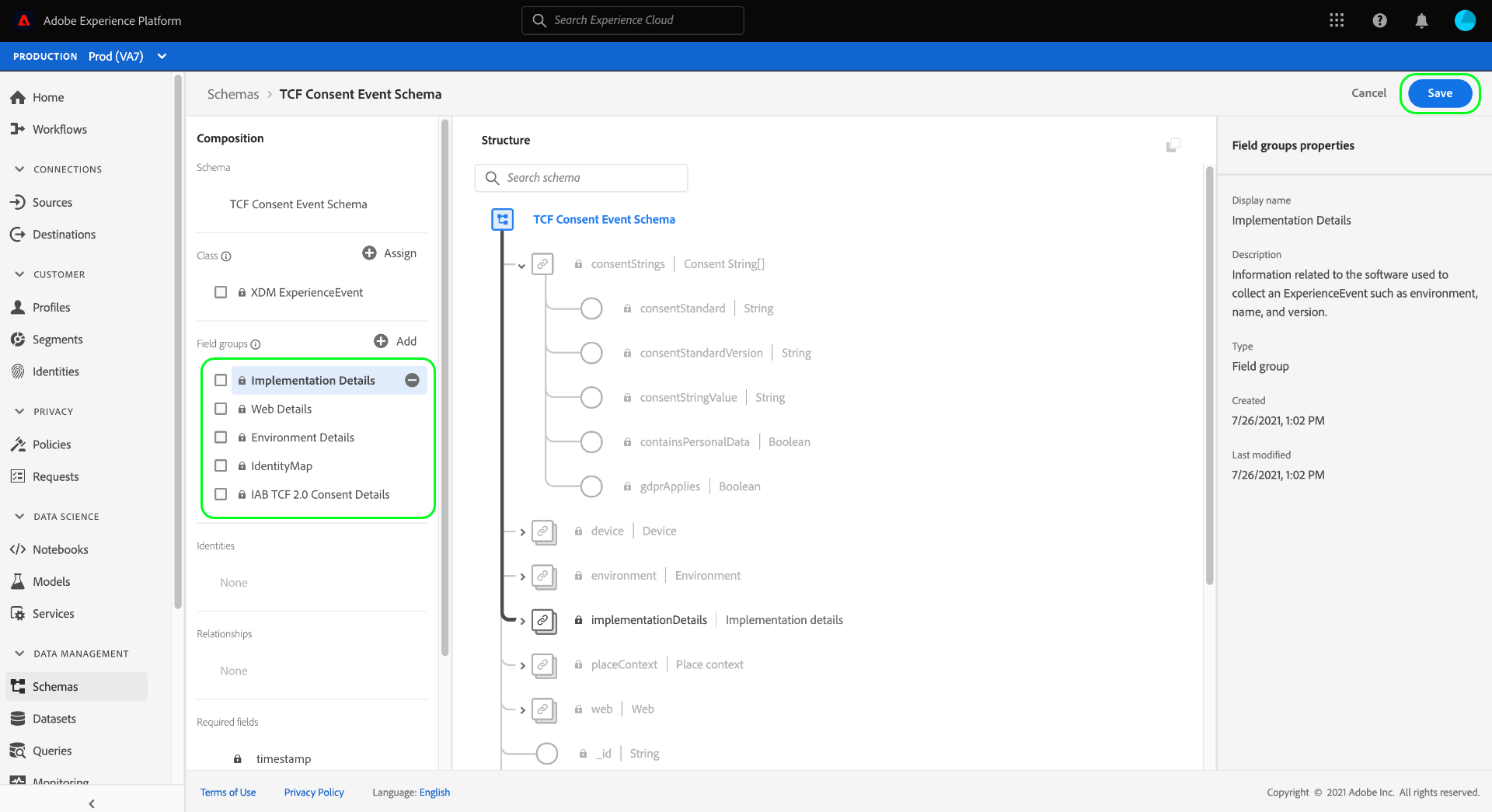 Se desideri tenere traccia degli eventi di modifica del consenso nel tempo, puoi aggiungere il gruppo di campi Dettagli consenso IAB TCF 2.0 allo schema XDM ExperienceEvent.