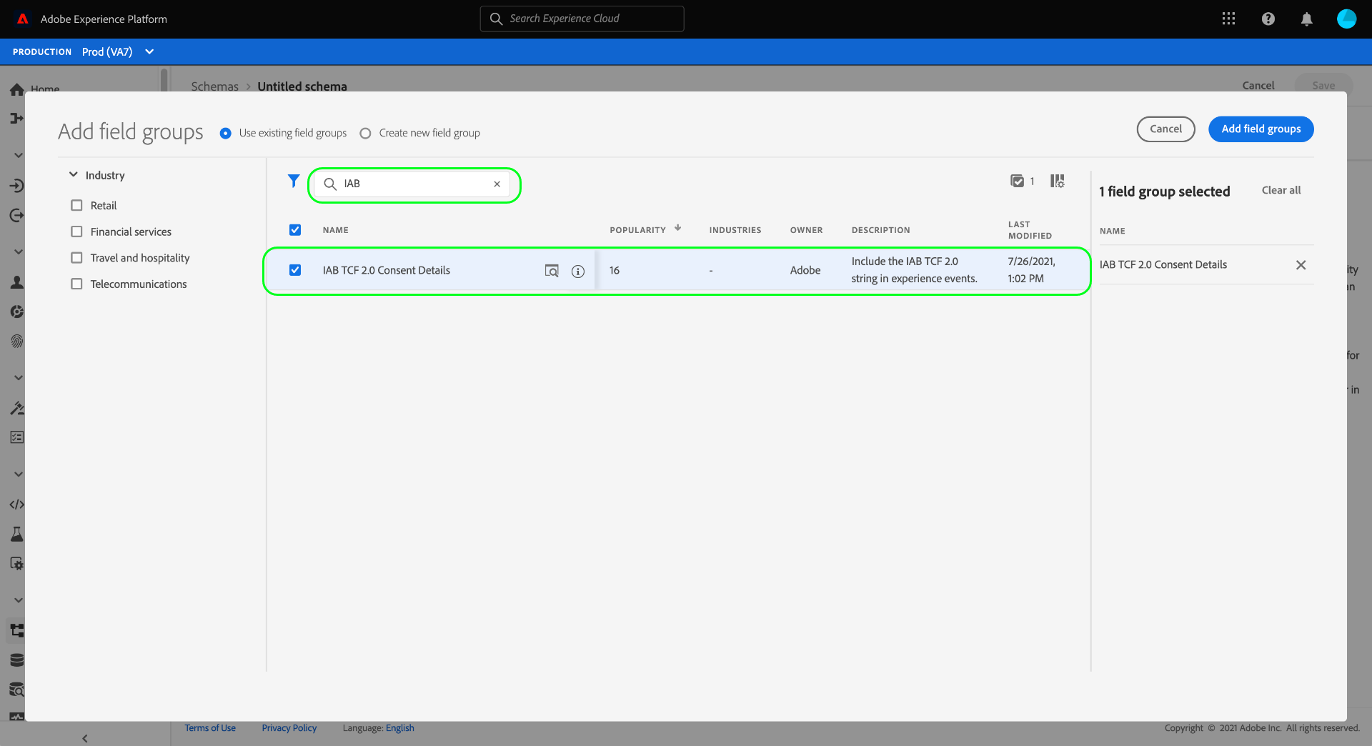 Dialogrutan Add field groups visas så att du kan börja lägga till fältgrupper i schemat direkt. Välj IAB TCF 2.0 Consent Details i listan härifrån. Du kan även använda sökfältet för att begränsa resultaten och enklare hitta fältgruppen.