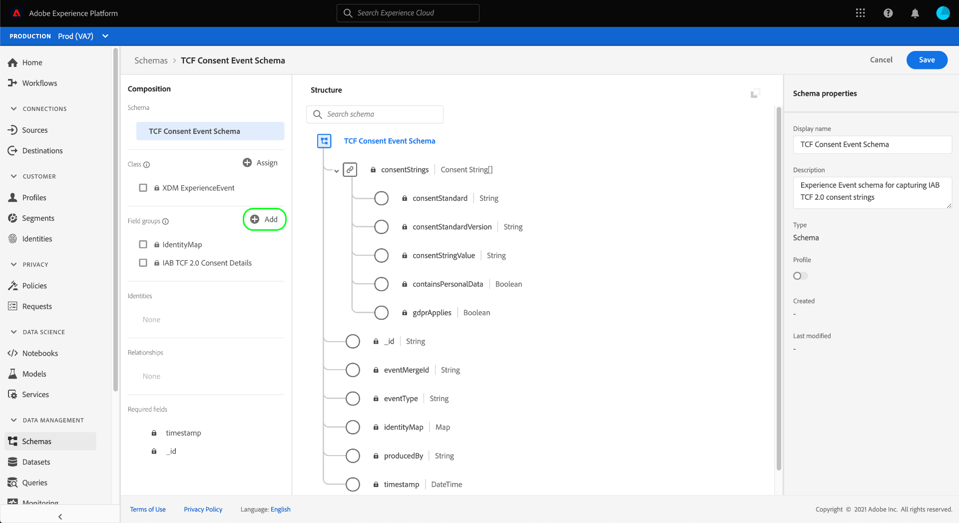 För att Adobe Experience Platform ska kunna behandla kundmedgivandedata i enlighet med IAB Transparency & Consent Framework (TCF) 2.0, måste dessa data skickas till datauppsättningar vars scheman innehåller TCF 2.0-tillståndsfält.
