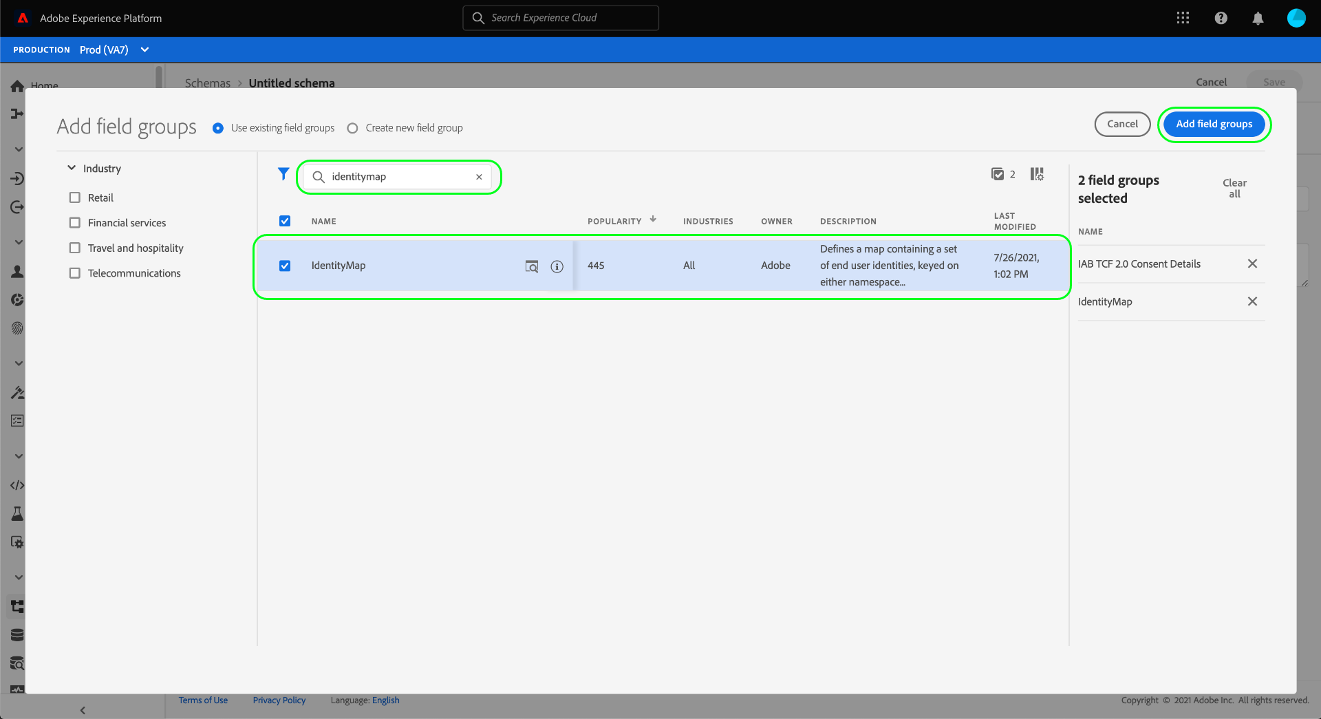 Leta sedan reda på fältgruppen IdentityMap i listan och markera den också. Välj Add field groups när båda fältgrupperna är listade i den högra listen.