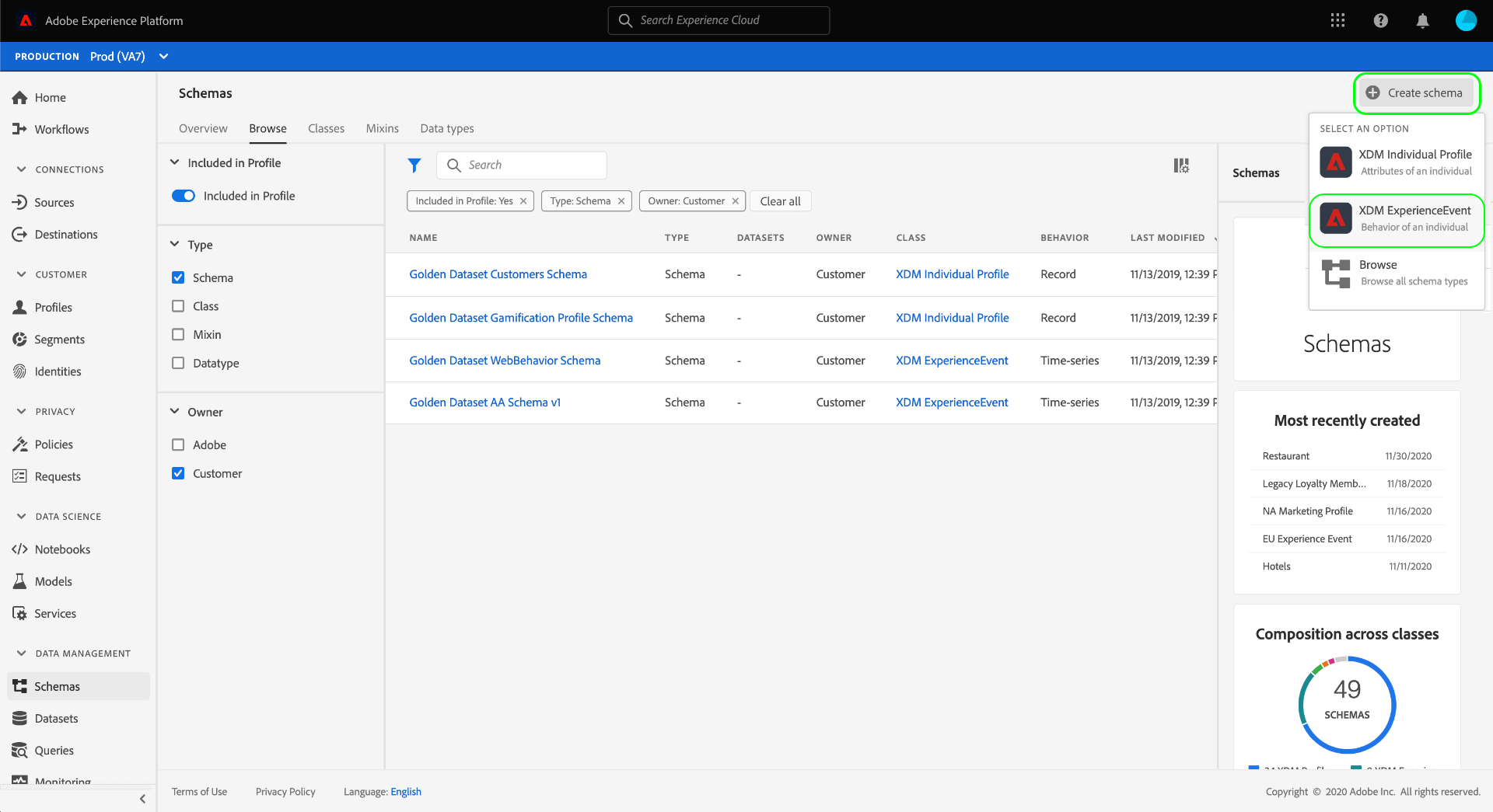 Välj Create schema på arbetsytan Schemas och välj sedan XDM ExperienceEvent i listrutan.