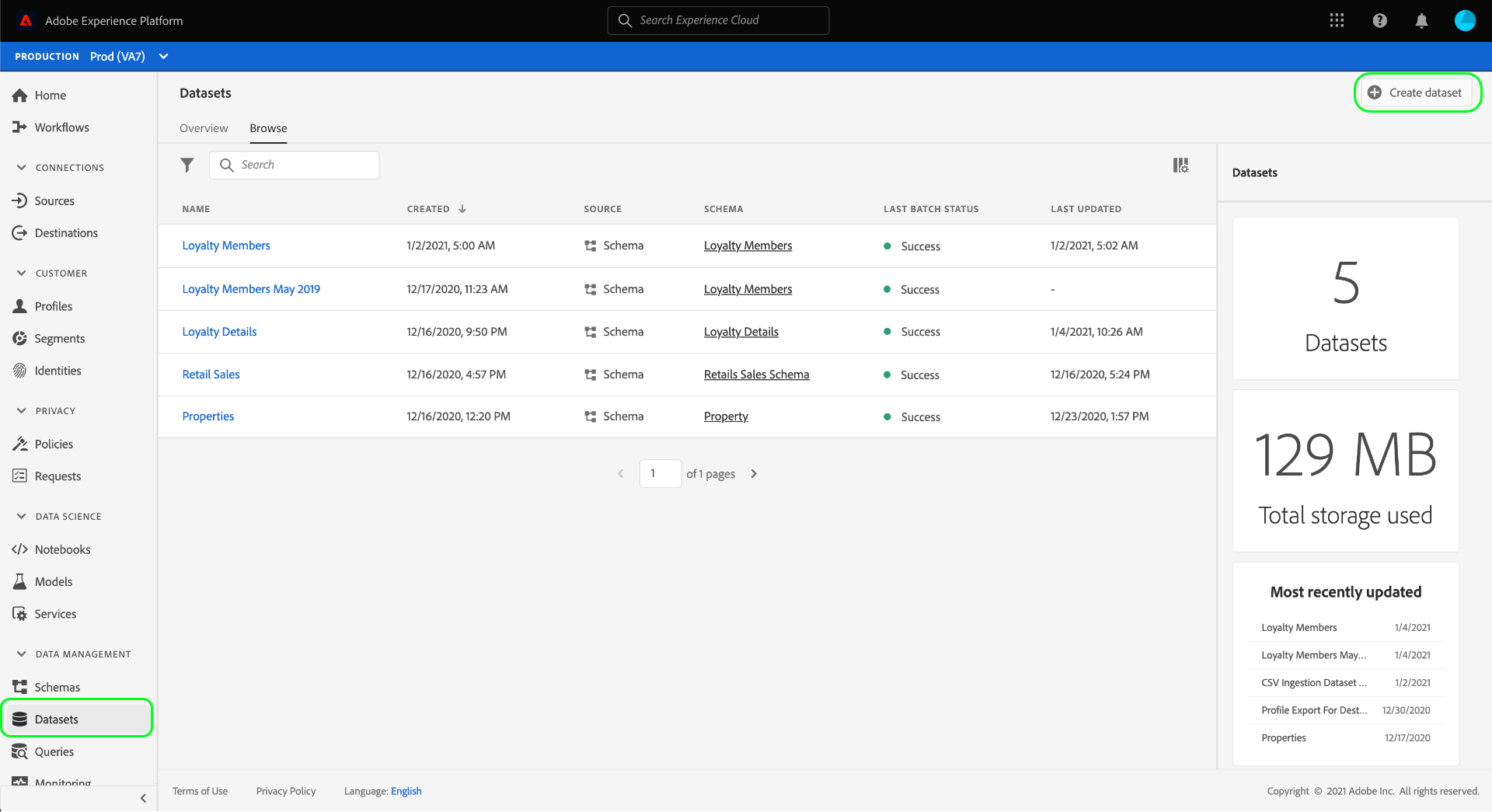 För vart och ett av de obligatoriska scheman som beskrivs ovan måste du skapa en datauppsättning som i slutändan kommer att innehålla kundernas medgivandedata. Datauppsättningen som baseras på postschemat måste aktiveras för Real-Time Customer Profile, medan datauppsättningen som baseras på tidsserieschemat inte ska vara Profile-aktiverad.