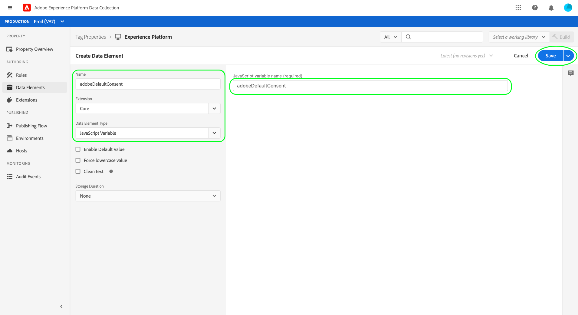 여기에서 JavaScript Variable을(를) 기반으로 adobeDefaultConsent 데이터 요소를 만들어야 합니다. 완료되면 Save​을 선택합니다.