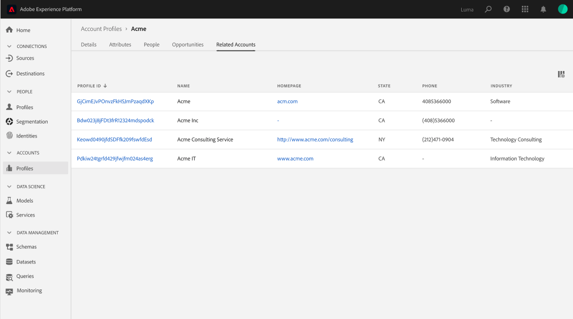 Vous pouvez afficher les comptes associés d’un compte que vous parcourez dans l’interface utilisateur d’Experience Platform.