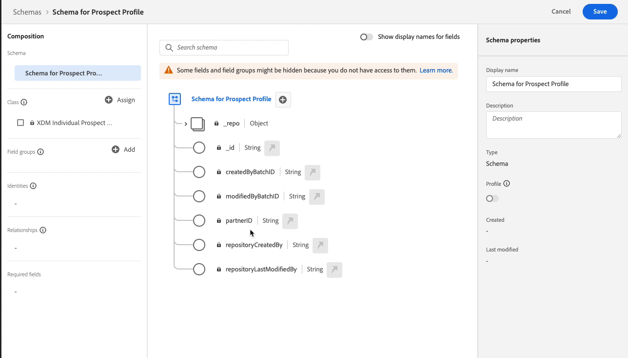接下來,在Data Management > Schemas中建立新的結構描述,並將其指派給 XDM Individual Prospect Profile 類別。