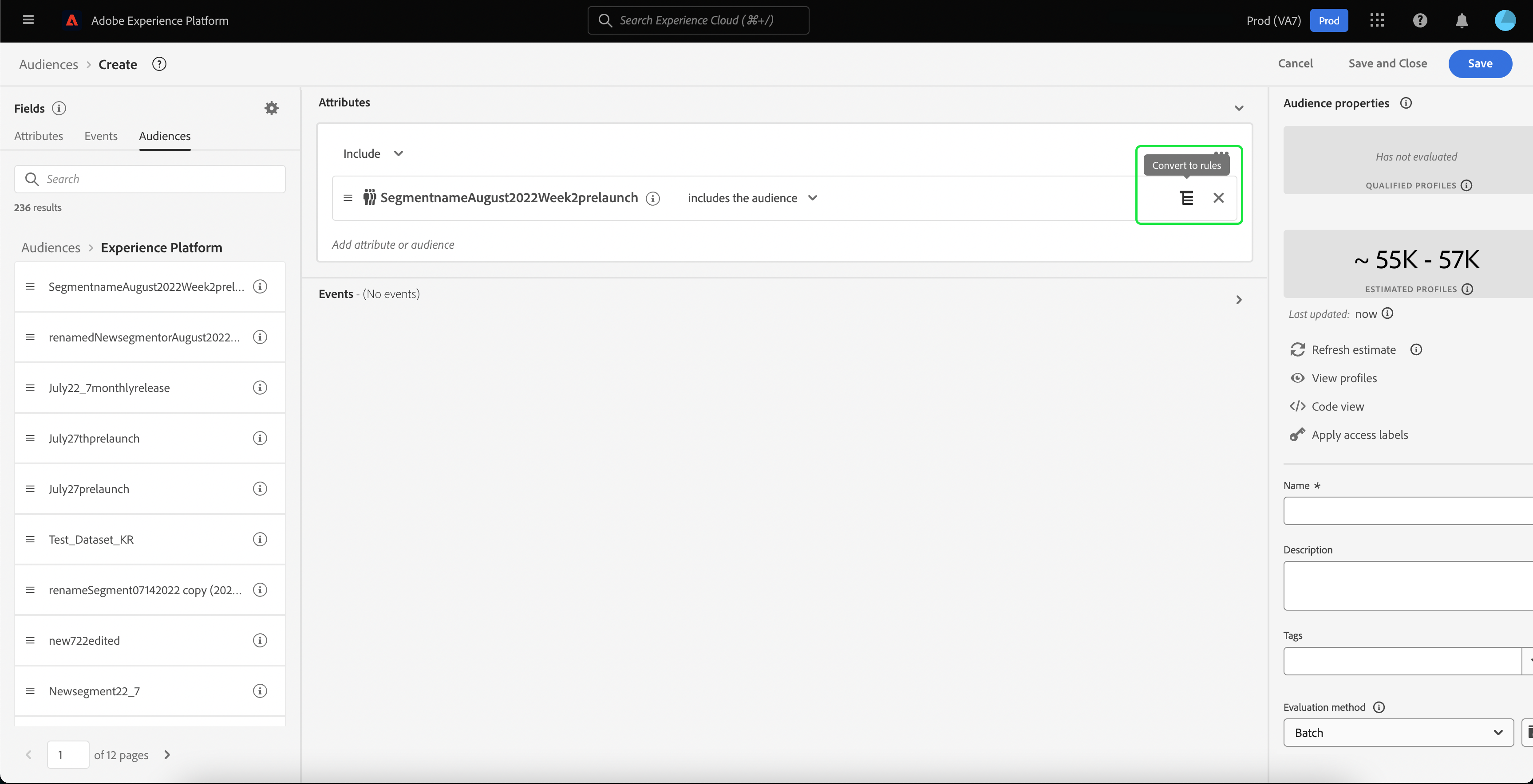 Experience Platform을(를) 사용하여 만든 Segment Builder개의 대상에 대해 해당 대상에 대한 세그먼트 정의에 사용된 규칙 세트로 대상을 변환할 수 있는 옵션이 제공됩니다. 이 변환은 규칙 논리의 사본을 만들어 원본 세그먼트 정의에 영향을 주지 않고 수정할 수 있습니다. 세그먼트 정의를 규칙 논리로 변환하기 전에 최근 변경 사항을 저장했는지 확인하십시오.