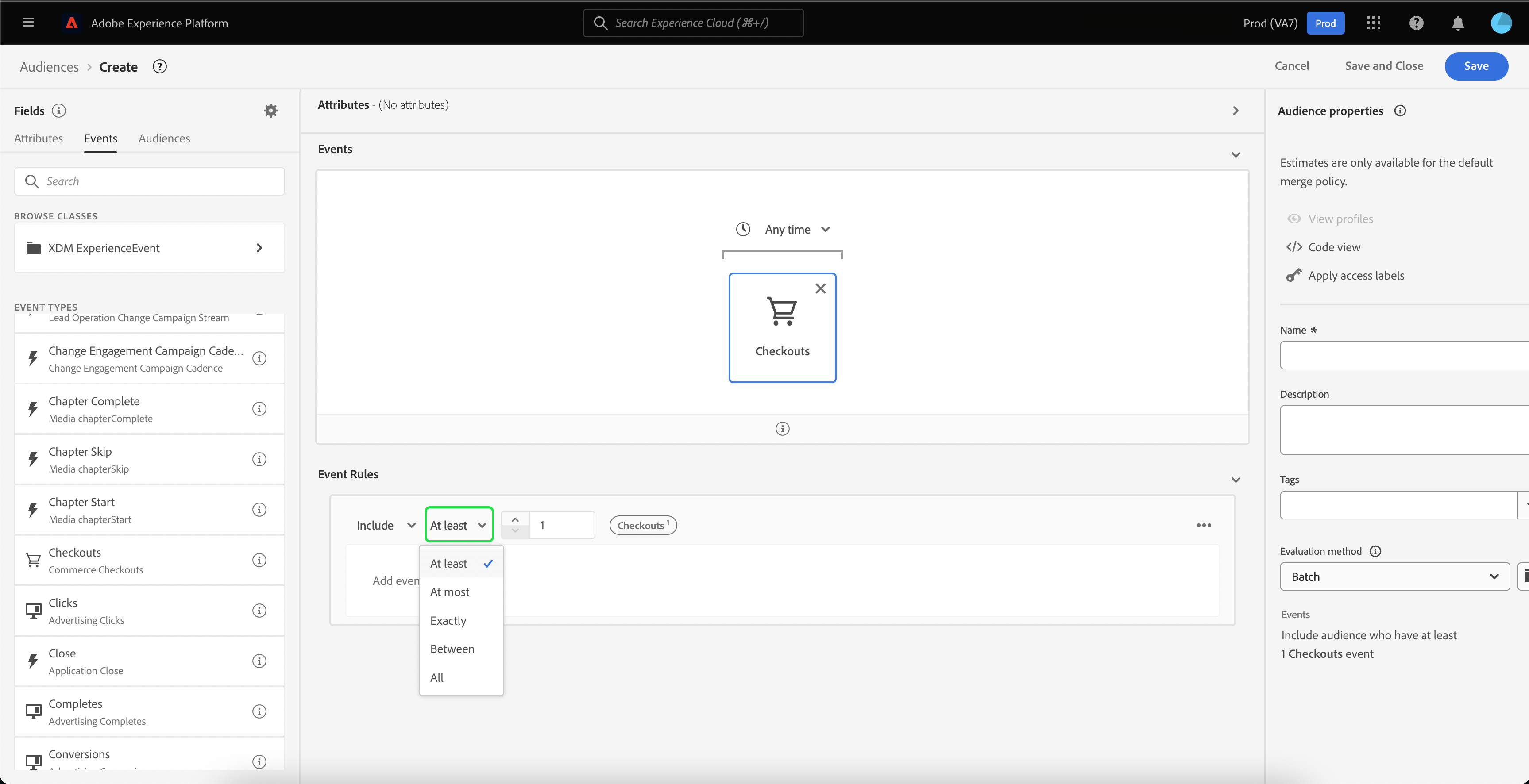 Audience properties 섹션에는 대상 이름, 설명 및 평가 유형을 포함하여 대상에 대한 중요한 정보를 지정할 수도 있습니다. 이름은 조직에서 정의한 세그먼트 정의 중에서 세그먼트 정의를 식별하는 데 사용되므로 설명적이고 간결하며 고유해야 합니다.