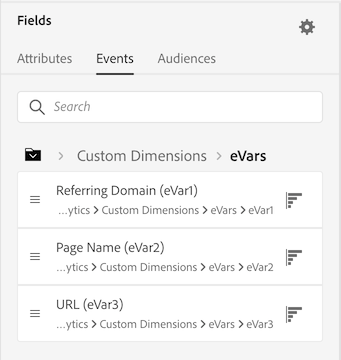단일 Analytics 보고서 세트의 데이터를 사용하는 경우 Experience Platform이 설명자와 친숙한 이름을 eVar에 자동으로 추가하므로 Segment Builder 내에서 해당 필드를 더 쉽게 찾을 수 있습니다.