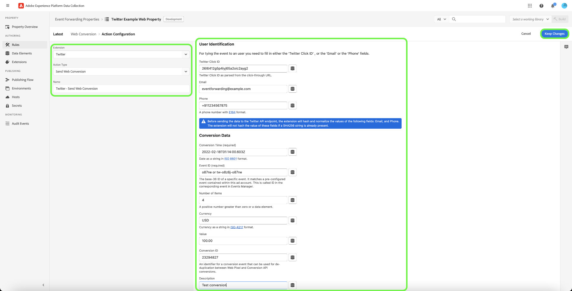 사용자가 확장 드롭다운에서 확장을 선택하면 데이터 요소 유형 드롭다운에 확장에서 제공하는 데이터 요소 유형이 채워집니다. 그런 다음 사용자는 각 데이터 요소를 소스 값에 매핑할 수 있습니다. 그런 다음 데이터 요소 변경 이벤트 또는 사용자 지정 코드 이벤트에서 규칙을 작성하여 실행할 규칙을 트리거할 때 데이터 요소를 사용할 수 있습니다. 데이터 요소는 데이터 요소 조건이나 규칙의 다른 조건, 예외 또는 작업에서 사용할 수도 있습니다.