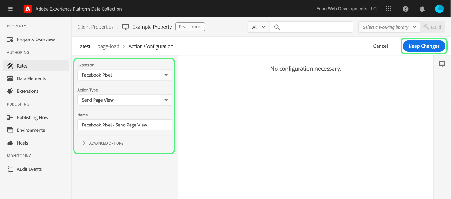 ACTIONS에서 추가를 선택합니다. 작업 구성 화면이 나타납니다.다음에 규칙을 적용할 확장을 선택하고 규칙이 트리거될 때 작업이 발생하도록 선택해야 합니다. 확장 드롭다운 목록에서 Facebook 픽셀 을 선택하고, 작업 유형 드롭다운 목록에서 페이지 보기 보내기를 선택합니다. 변경 내용 유지를 선택한 다음, 다음 규칙 편집 화면에서 저장을 선택합니다.