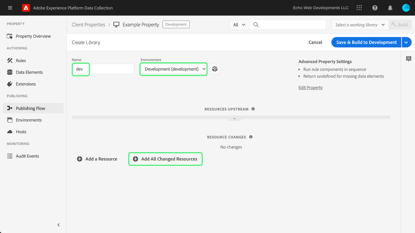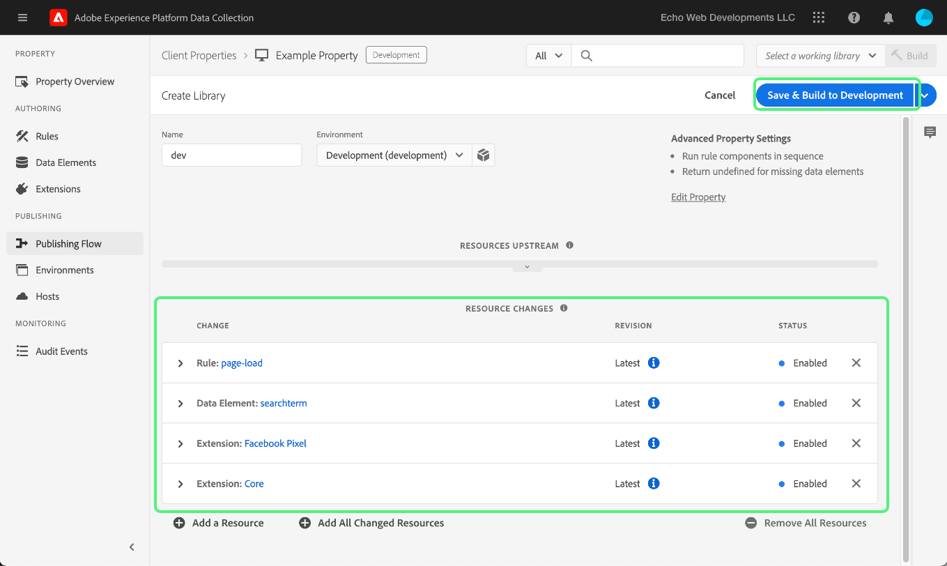 모든 변경 사항이 새로 만든 라이브러리(제공된 예에서 dev)에 포함되었으므로 Save and Build to Development를 선택합니다.