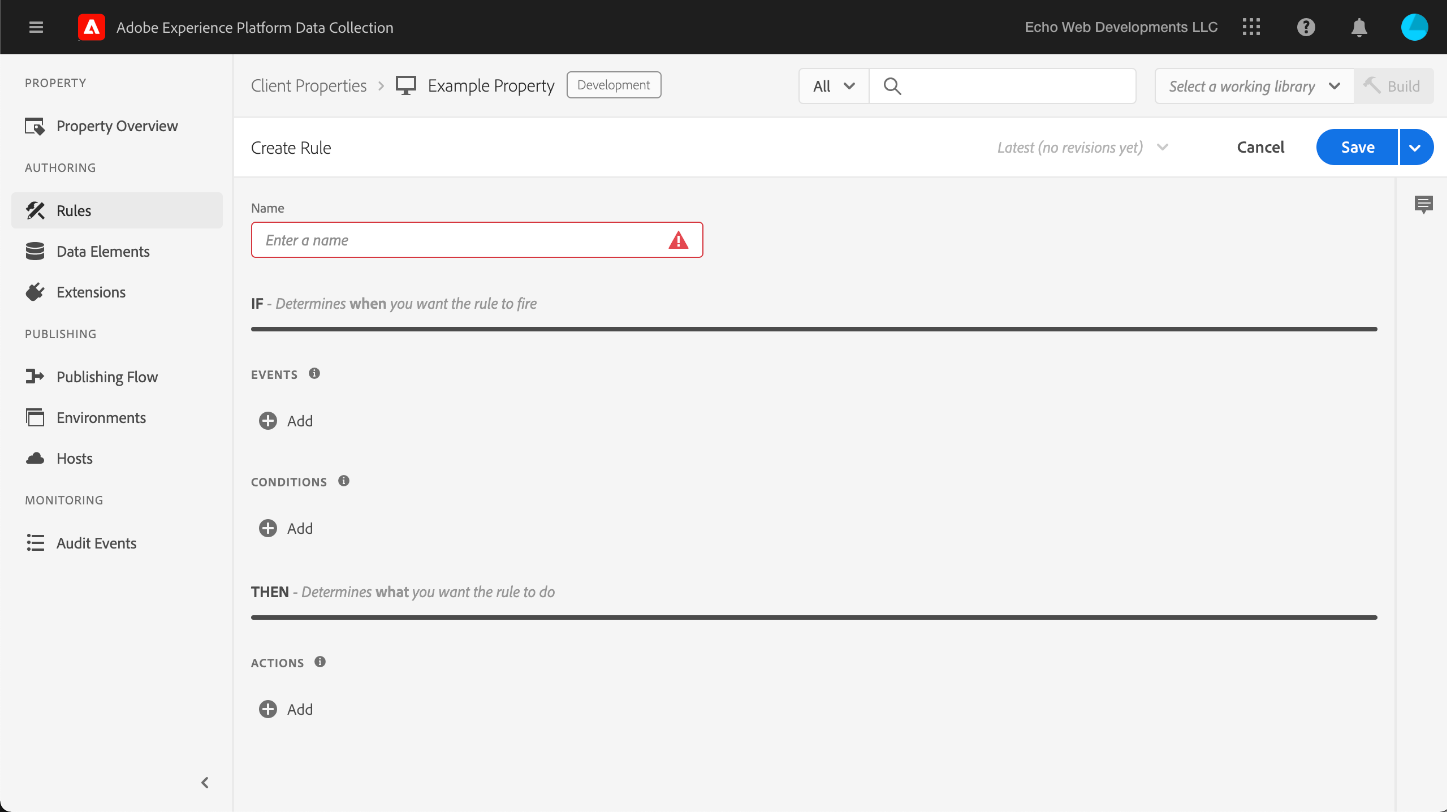 Window Loaded 이벤트 유형은 페이지가 테스트 사이트에 로드될 때마다 이 규칙이 트리거되도록 합니다. 변경 내용 유지를 선택합니다. 이 예제에서는 테스트 사이트의 페이지에 대해 규칙을 트리거해야 하므로 Conditions을 무시합니다.