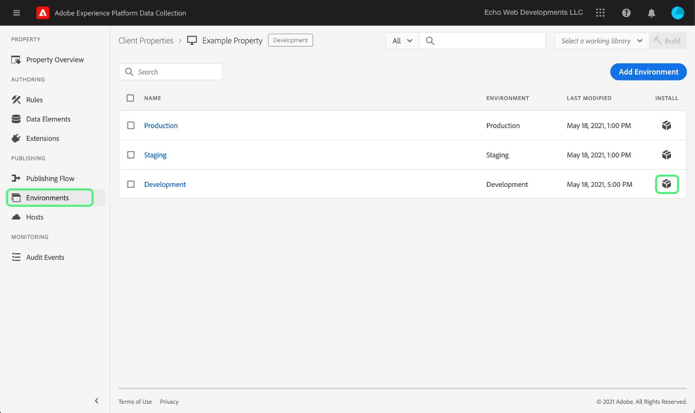 설치 지침은 환경 탭에서 확인할 수 있습니다. 이 페이지에는 사용 가능한 모든 환경이 표시되며, 더 많은 환경을 만들 수도 있습니다. 라이브러리가 개발 환경에 게시되면 개발 행의 INSTALL 열에서 상자 아이콘을 선택합니다.