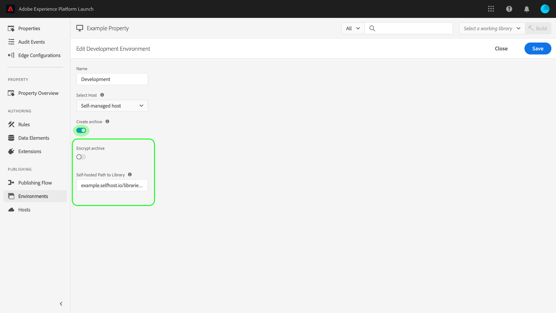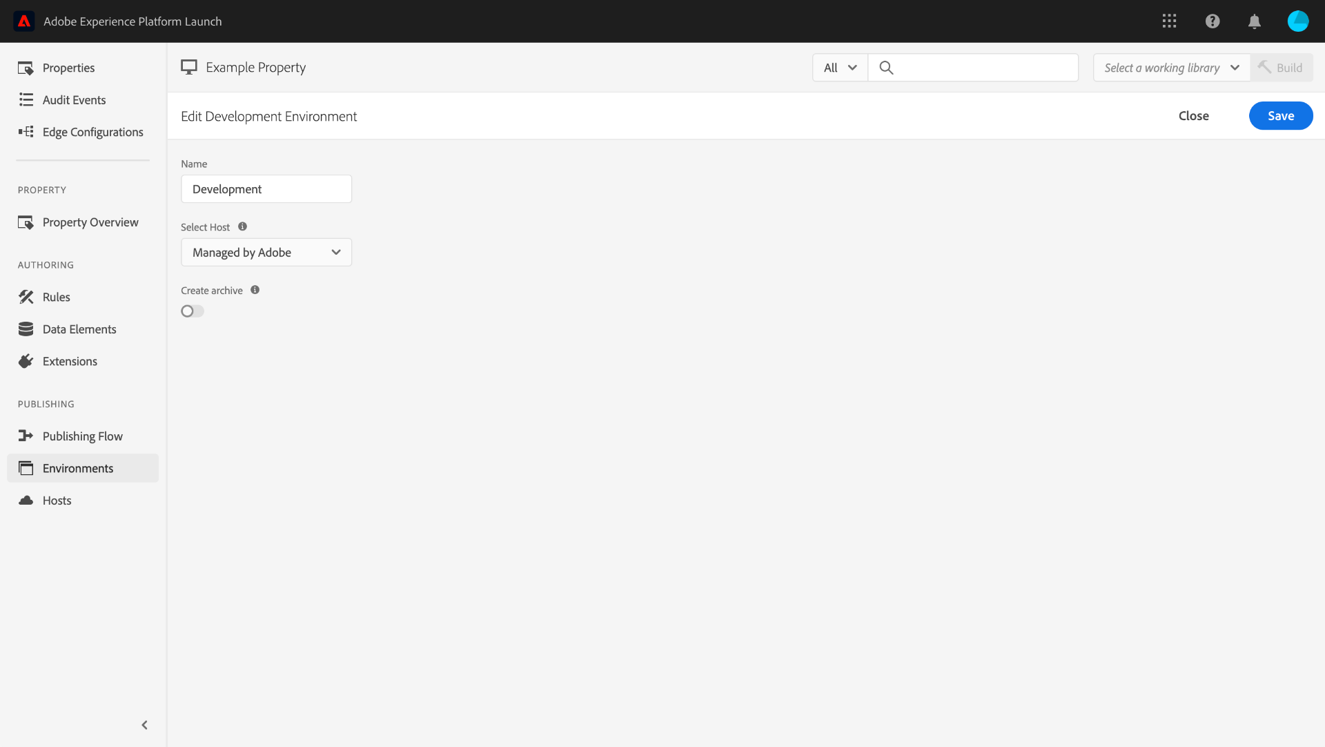 Le bouton Créer une archive vous permet d’activer/désactiver le paramètre d’archivage de l’environnement. Par défaut, l’option d’archivage est désactivée et la version est diffusée dans un format qui s’exécute en l’état (JavaScript pour les propriétés web et JSON pour les propriétés mobiles).