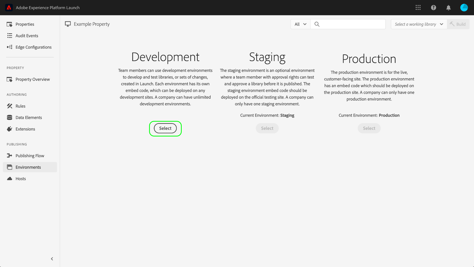 Trois environnements sont automatiquement affectés à une propriété lors de sa création : développement, staging et production. Ces environnements suffisent pour exécuter le processus de publication. Cependant, vous pouvez ajouter d’autres environnements de développement si vous le souhaitez, car cela peut s’avérer utile pour des équipes plus importantes dans lesquelles plusieurs développeurs travaillent simultanément sur différents projets.