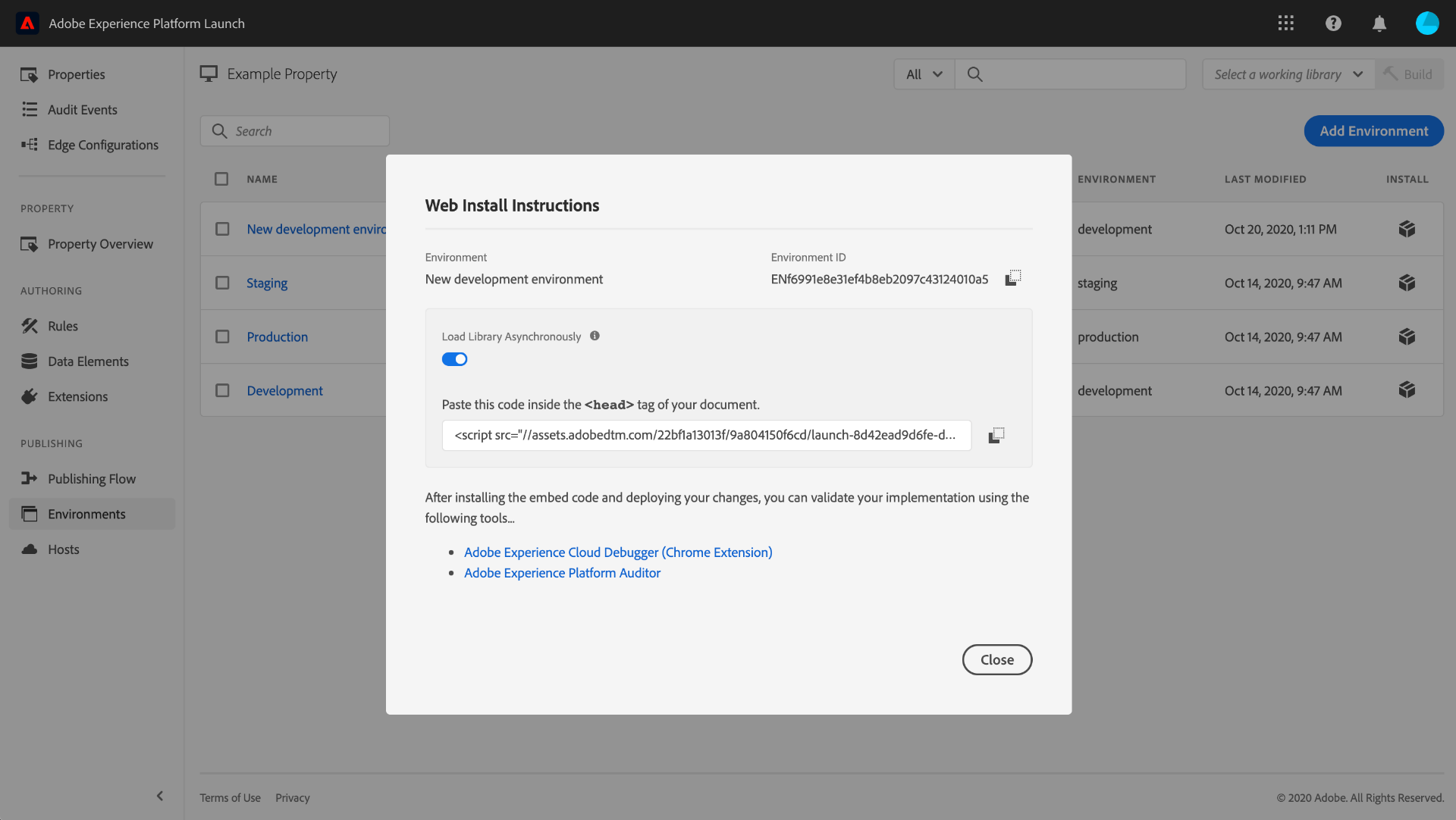 Lorsque vous créez une version de bibliothèque, vous devez l’affecter à un environnement. Les extensions, règles et éléments de données de la version sont ensuite compilés et placés dans l’environnement attribué. Chaque environnement fournit un code incorporé unique qui vous permet d’intégrer la version qui lui est assignée dans votre site.