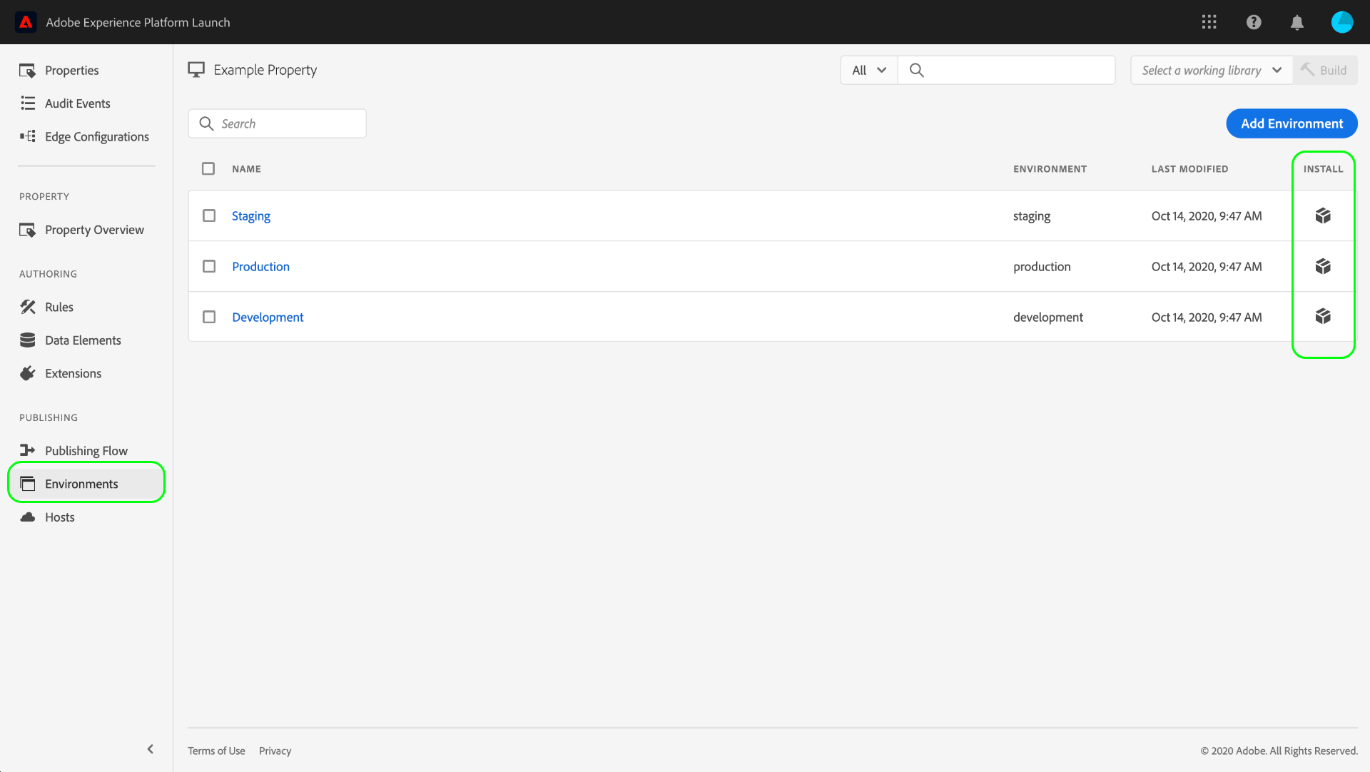 Pour accéder aux instructions d’installation d’un environnement, accédez à l’onglet Environnements correspondant à votre propriété, puis sélectionnez l’icône Installer correspondant à cet environnement.