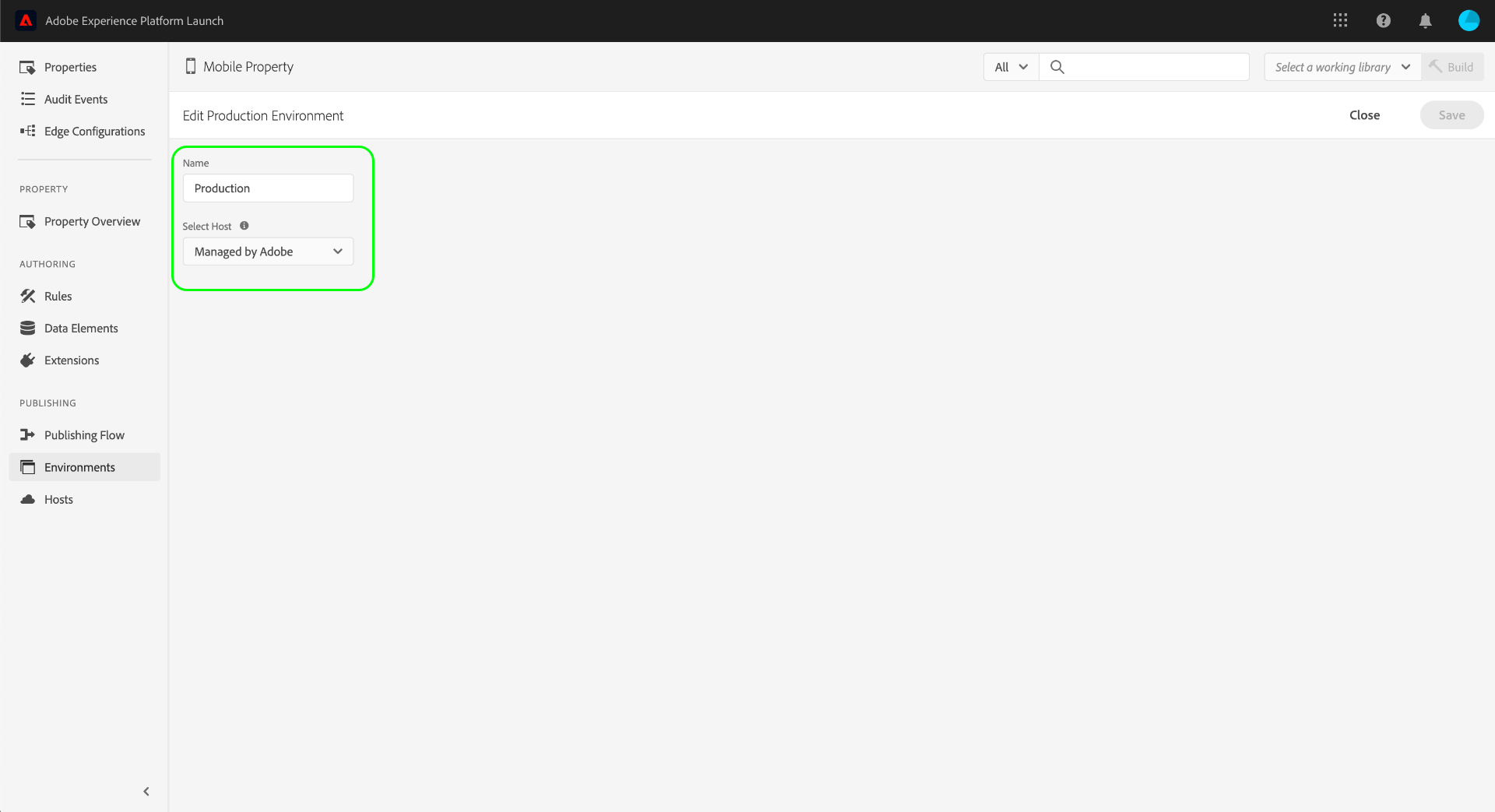 Pour les propriétés mobiles, vous pouvez voir les options de configuration d’un environnement en le sélectionnant dans la liste. À partir de là, vous pouvez modifier le nom de l’environnement. Actuellement, les environnements mobiles ne peuvent utiliser que des hôtes gérés par Adobe.