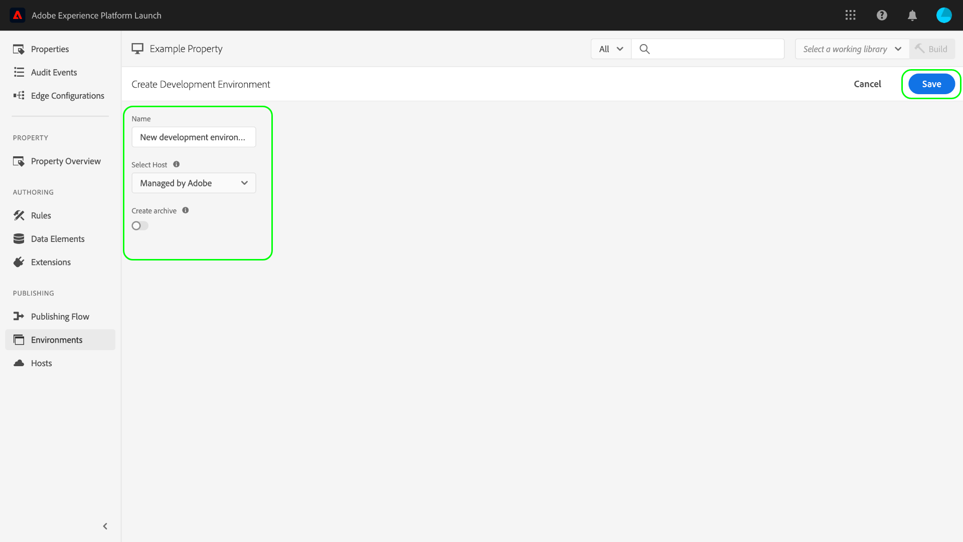 다음 화면에서는 새 환경의 이름을 지정하고, 호스트를 선택하고, 아카이브 설정을 선택할 수 있습니다. 완료되면 을 선택합니다 저장 환경을 만듭니다.