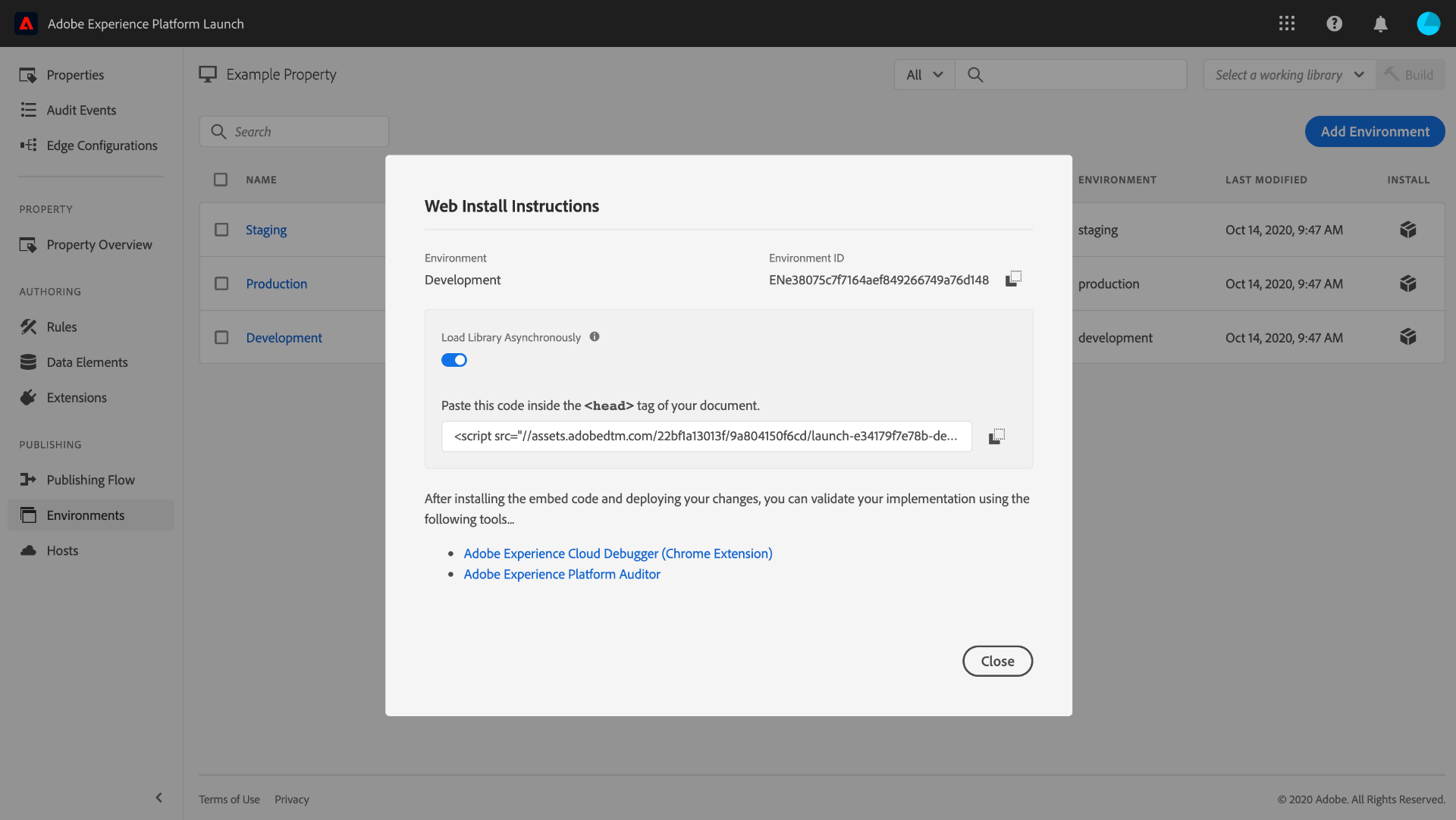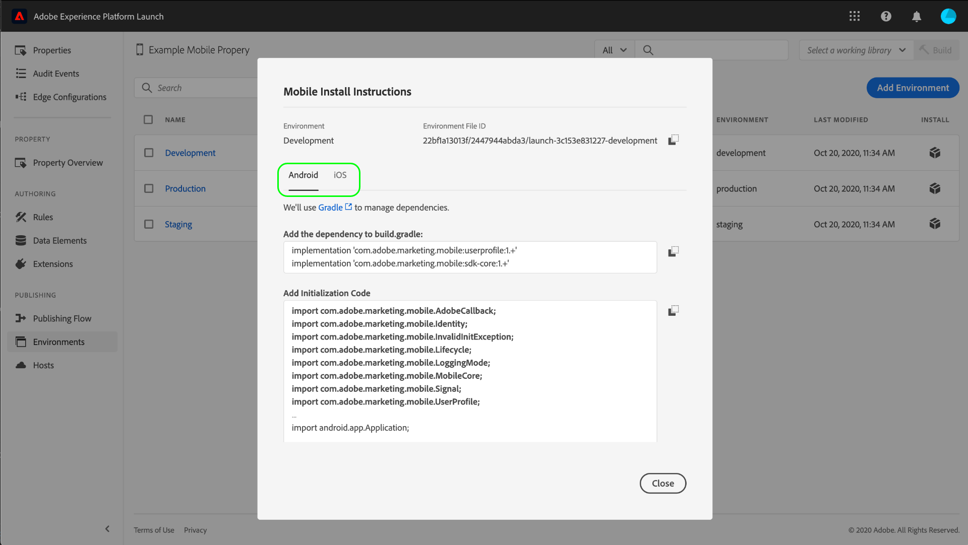 각 환경에는 애플리케이션에 연결하는 데 사용되는 일련의 지침이 있습니다. 웹 속성의 경우 이 지침은 포함 코드를 제공합니다. 모바일 속성의 경우 이러한 지침은 사용 중인 라이브러리를 인스턴스화하고 런타임 시 구성을 검색하는 데 필요한 코드를 제공합니다.