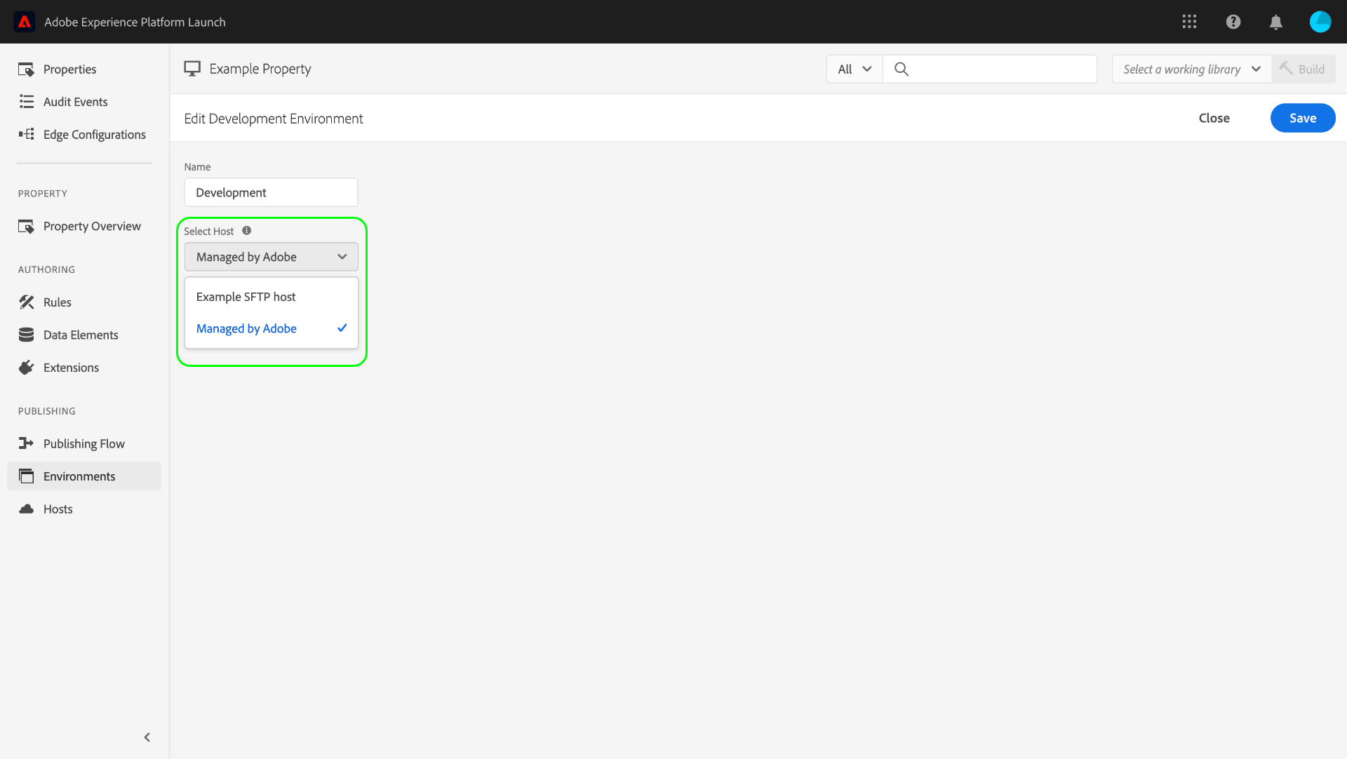 모바일 속성의 경우 목록에서 해당 구성 옵션을 선택하여 환경에 대한 구성 옵션을 볼 수 있습니다. 여기서 환경의 이름을 변경할 수 있습니다. 현재 모바일 환경에서는 Adobe 관리 호스트만 사용할 수 있습니다.
