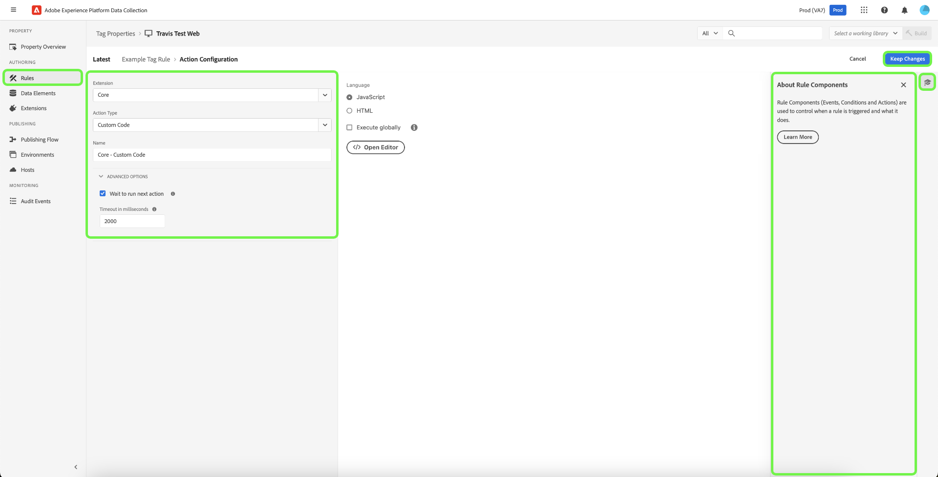 Actions (Then): Triggers occur after a rule’s events take place and all conditions are satisfied. A tag rule can trigger as many discrete actions as you want, and you can control the order in which these actions occur. For example, a single rule for an e-commerce Thank You page can trigger your analytics tools and third-party tags from a single rule. There is no need to create separate rules for each extension or tag.