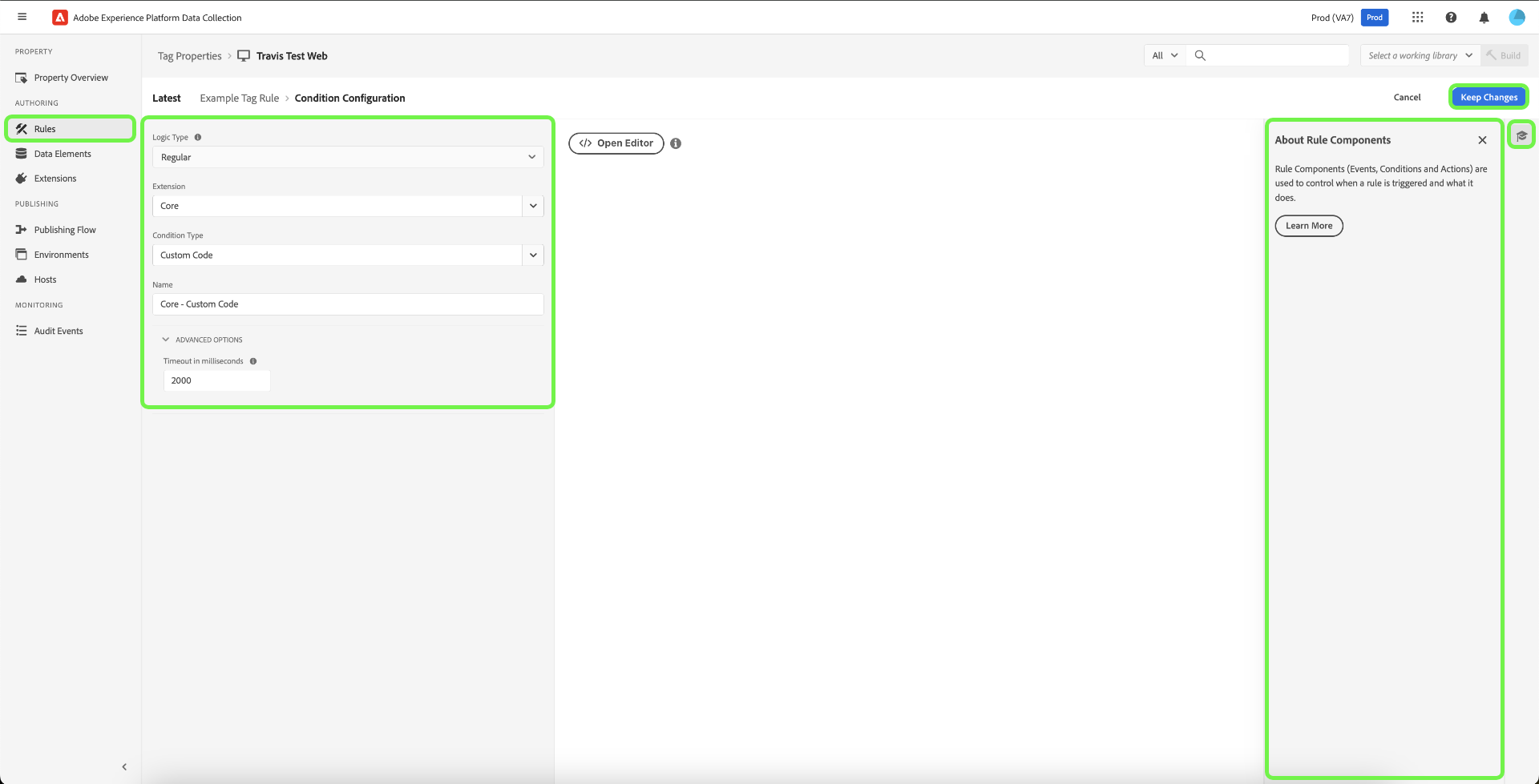 (Advanced) Timeout: This option is available when rule component sequencing is enabled on your property. This attribute defines the maximum amount of time allowed for the condition to run. If the timeout is reached, the condition fails and the remainder of the rule’s conditions and actions will be removed from the processing queue. The default is 2000ms.