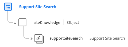 Support Site Search är en standardschemafältgrupp för XDM ExperienceEvent klassen. Det tillhandahåller ett enskilt siteKnowledge.supportSiteSearch-objekt till ett schema som samlar in information om en sökning på en supportwebbplats.