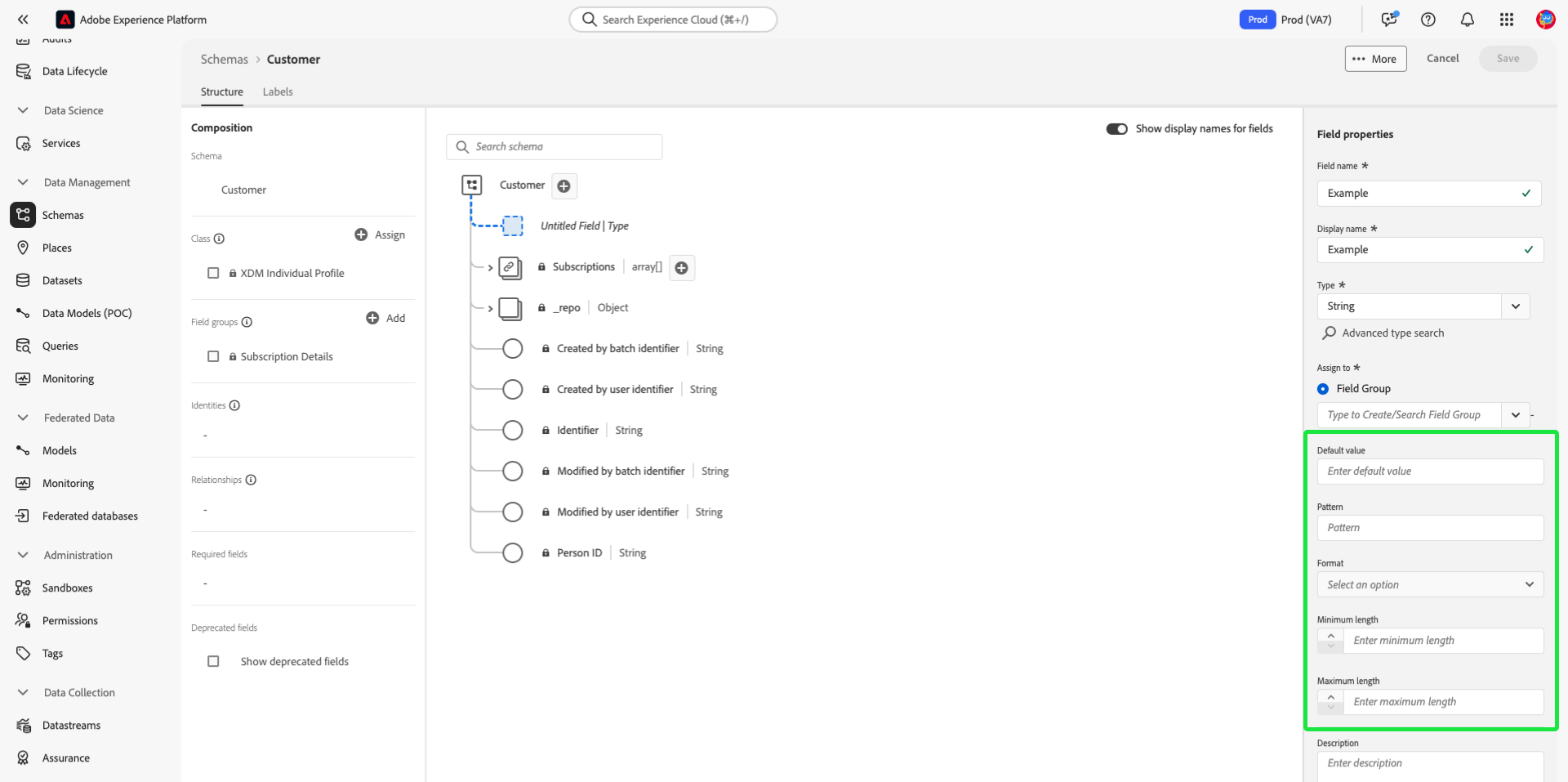 _idinte används som en identitet: Fältet_idi Experience Event-scheman kan inte användas som en identitet eftersom det är avsett för postidentitet. - Ange längdbegränsningar: Det är bäst att ange minsta och högsta längd för fält som markerats som identiteter. En varning utlöses om du försöker tilldela ett anpassat namnutrymme till ett identitetsfält utan att uppfylla begränsningarna för minsta och högsta längd. Dessa begränsningar bidrar till att upprätthålla enhetlighet och datakvalitet.