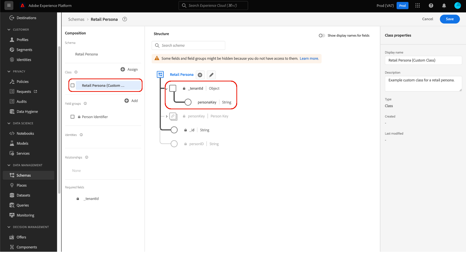 Después de aplicar los cambios, el nuevo campo aparece en el área de nombres de ID de inquilino dentro del objeto estándar. Este área de nombres anidada evita conflictos de nombre de campo dentro del propio grupo de campos para evitar cambios importantes en otros esquemas que utilizan el mismo grupo de campos.