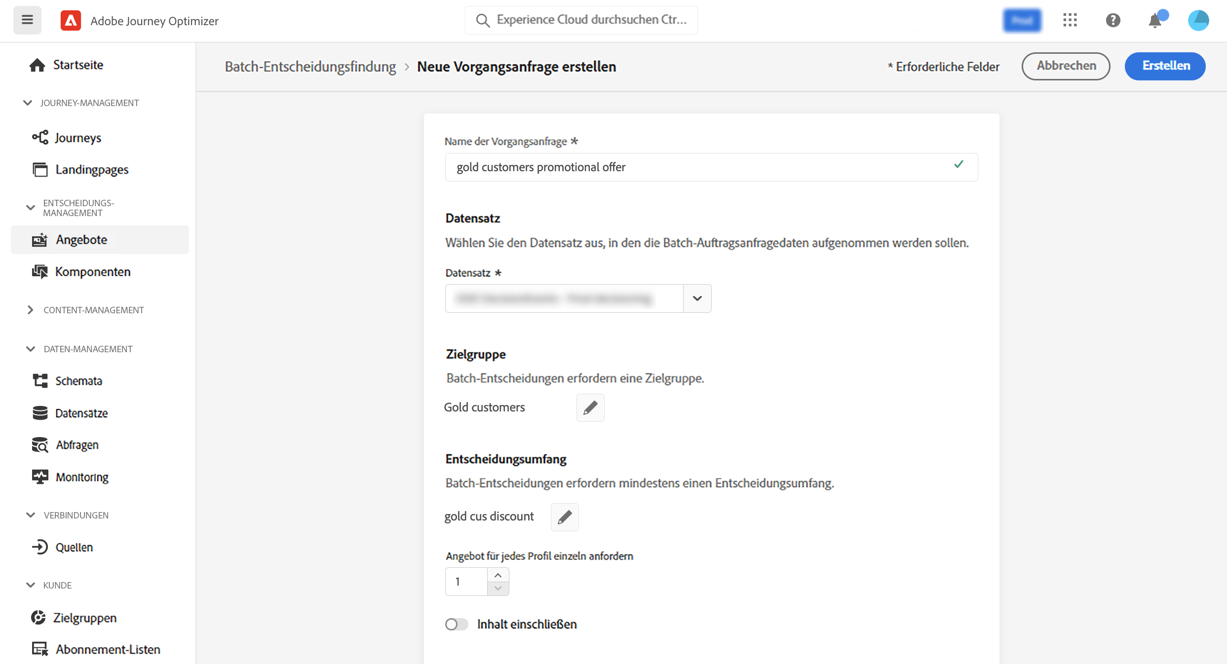 Dazu müssen Sie in Journey Optimizer eine Auftragsanfrage erstellen, die Informationen zur gewünschten Zielgruppe und zur zu verwendenden Angebotsentscheidung enthält. Der Angebotsinhalt für jedes Profil in der Zielgruppe wird daraufhin in einen Adobe Experience Platform-Datensatz platziert, über den er für benutzerdefinierte Batch-Workflows zur Verfügung steht.