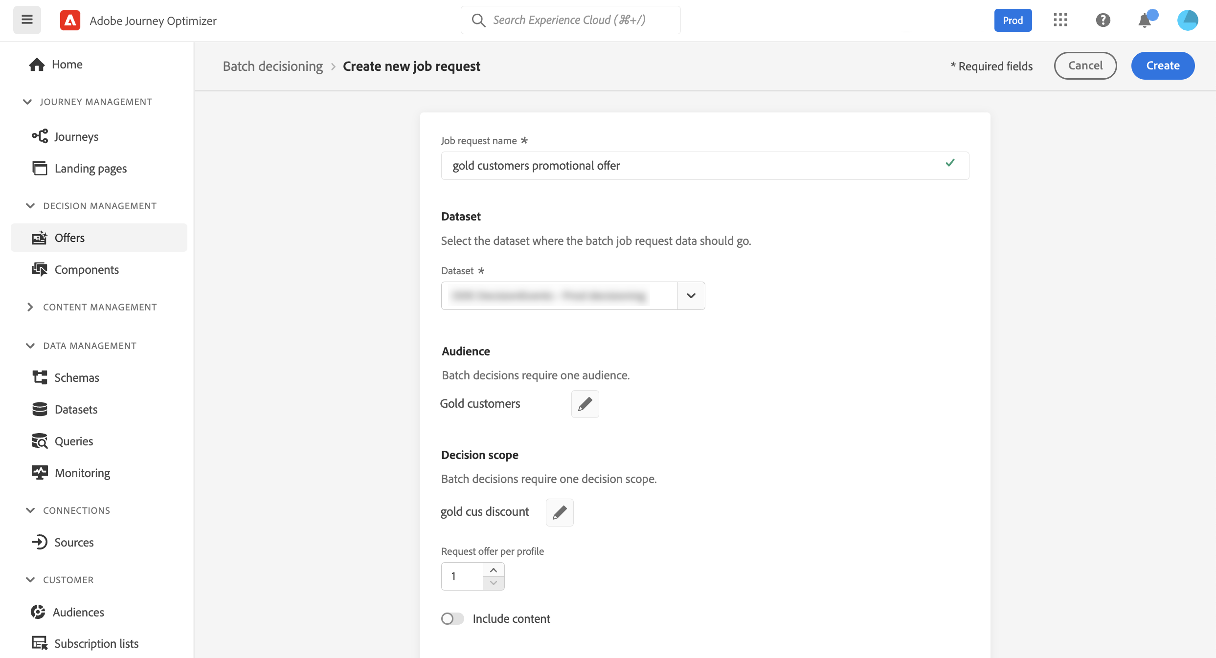 Para ello, debe crear una solicitud de trabajo en Journey Optimizer que contenga información sobre la audiencia de destino y la decisión de oferta que debe utilizar. El contenido de la oferta para cada perfil de la audiencia se coloca entonces en un conjunto de datos de Adobe Experience Platform, donde está disponible para flujos de trabajo por lotes personalizados.