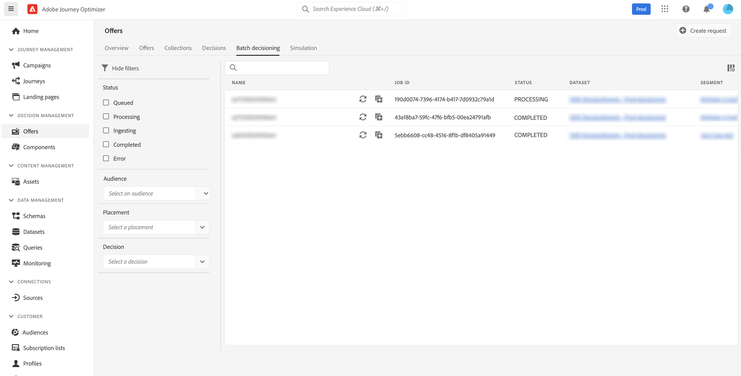 note note NOTE Un trabajo por lotes se ejecuta fuera de la instantánea de perfil que se produce una vez al día. La toma de decisiones por lotes limita la frecuencia y siempre carga perfiles de la instantánea más reciente. Espere hasta 24 horas después de crear una audiencia antes de probar la API de decisiones por lotes. -