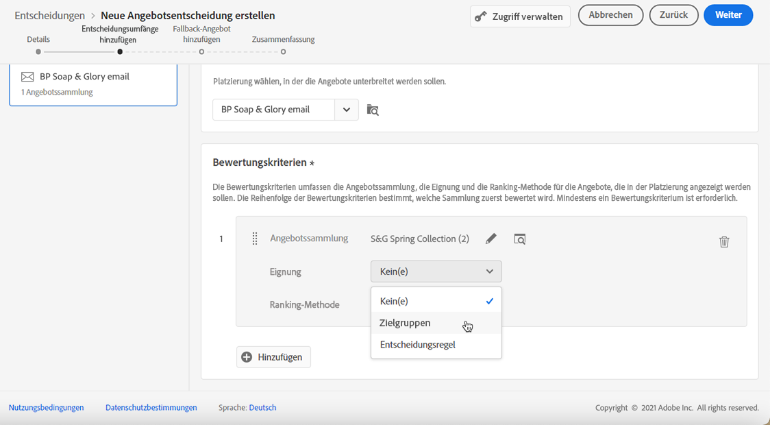2. Klicken Sie auf Hinzufügen, um Auswertungskriterien für diese Platzierung auszuwählen.