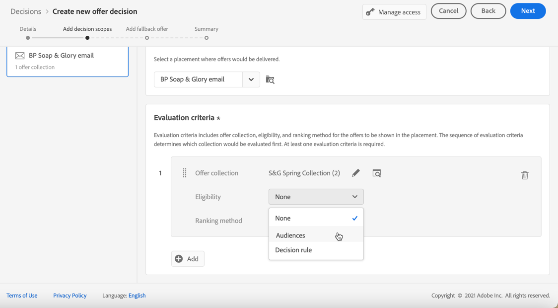 Para agregar otra ubicación para sus ofertas como parte de esta decisión, use el botón Nuevo ámbito. Repita los pasos anteriores para cada ámbito de decisión.