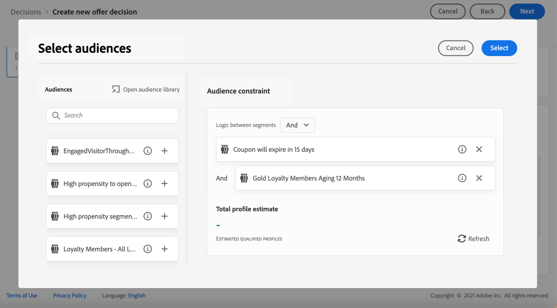 Al seleccionar audiencias o reglas de decisión, puede ver información sobre los perfiles cualificados estimados. Haga clic en Actualizar para actualizar los datos.