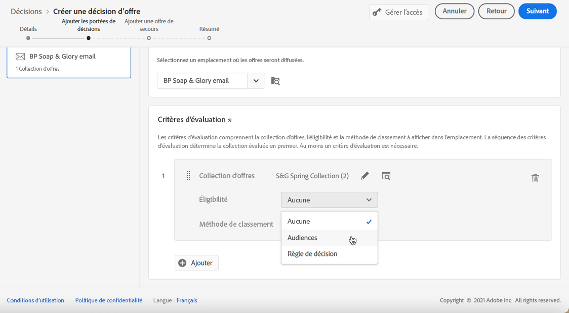 4. Utilisez le champ Éligibilité pour restreindre la sélection des offres pour cet emplacement.