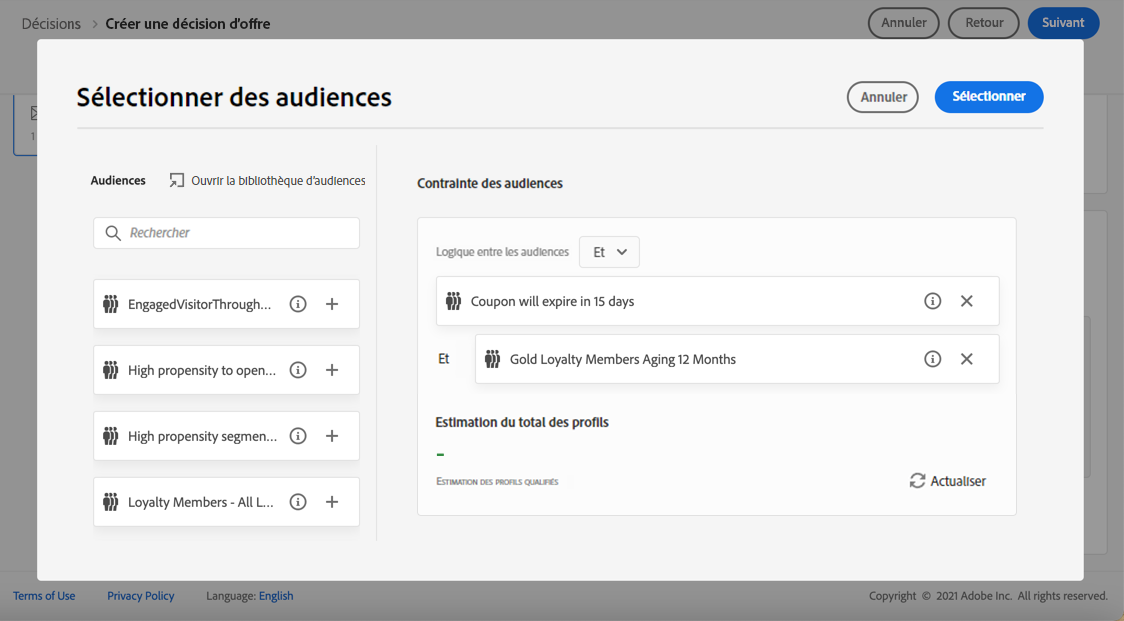5. Lorsque vous sélectionnez des audiences ou des règles de décision, vous pouvez afficher des informations sur les profils qualifiés estimés. Cliquez sur Actualiser pour mettre à jour les données.