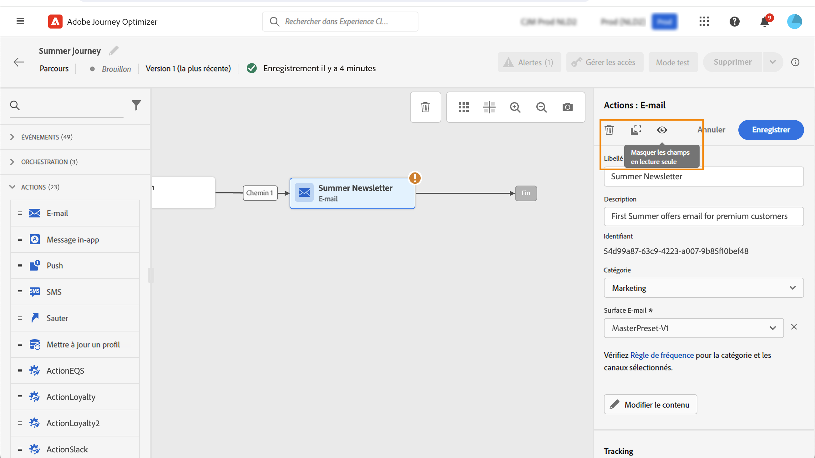 Pour une meilleure lisibilité, masquez ces paramètres à l’aide du bouton Masquer les champs en lecture seule situé en haut du volet de droite.