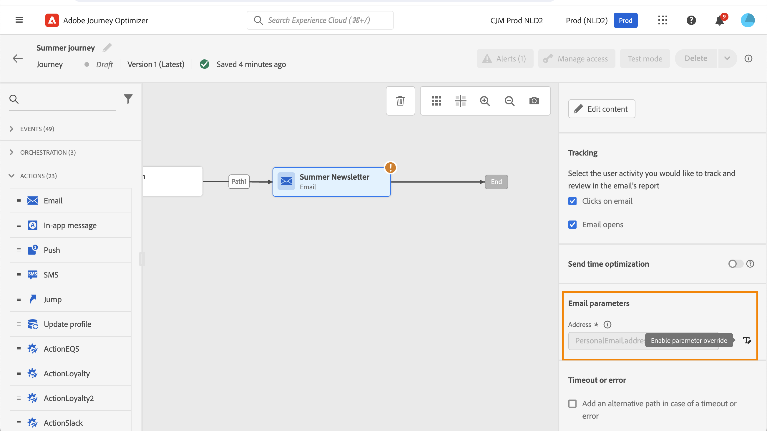 Quando si verifica un errore in un’azione o in una condizione, il percorso di un singolo utente si interrompe. L'unico modo per far sì che continui è selezionare la casella Aggiungi un percorso alternativo in caso di timeout o errore. Vedi questa sezione.
