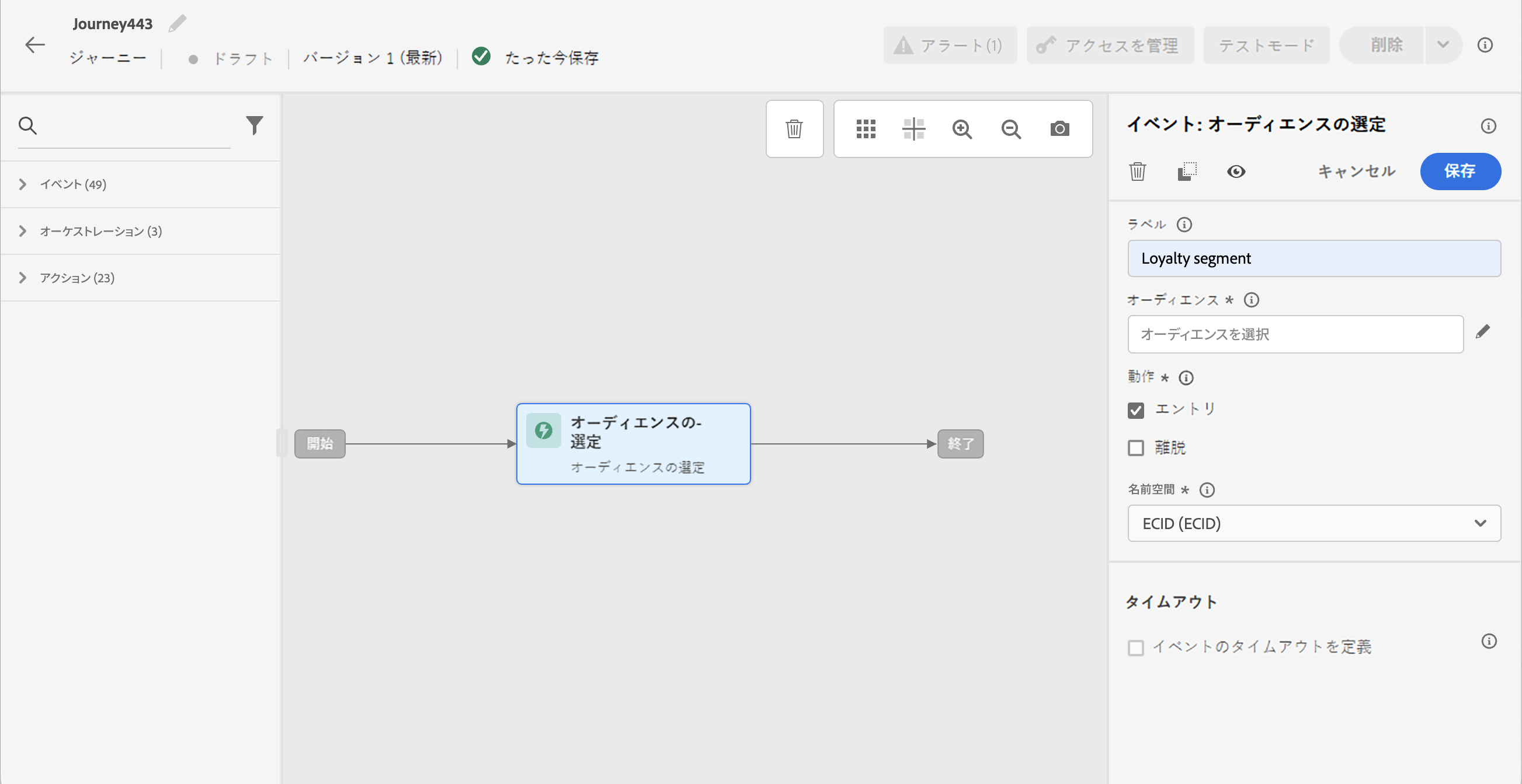 イベントカテゴリを展開し、オーディエンスの選定アクティビティをキャンバスにドロップします。