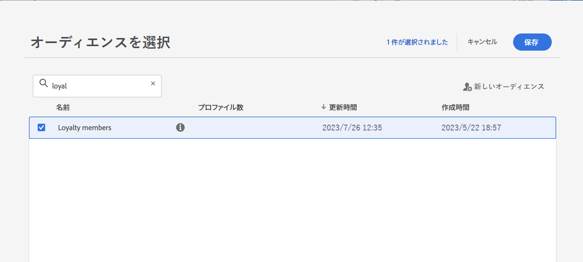 note note NOTE 構成ワークフローとカスタムアップロードを使用して作成されたオーディエンスのバッチ特性により、「オーディエンスの選定」アクティビティでこれらのオーディエンスをターゲットにすることはできません。このアクティビティでは、セグメント定義を使用して作成されたオーディエンスのみを利用できます。 -