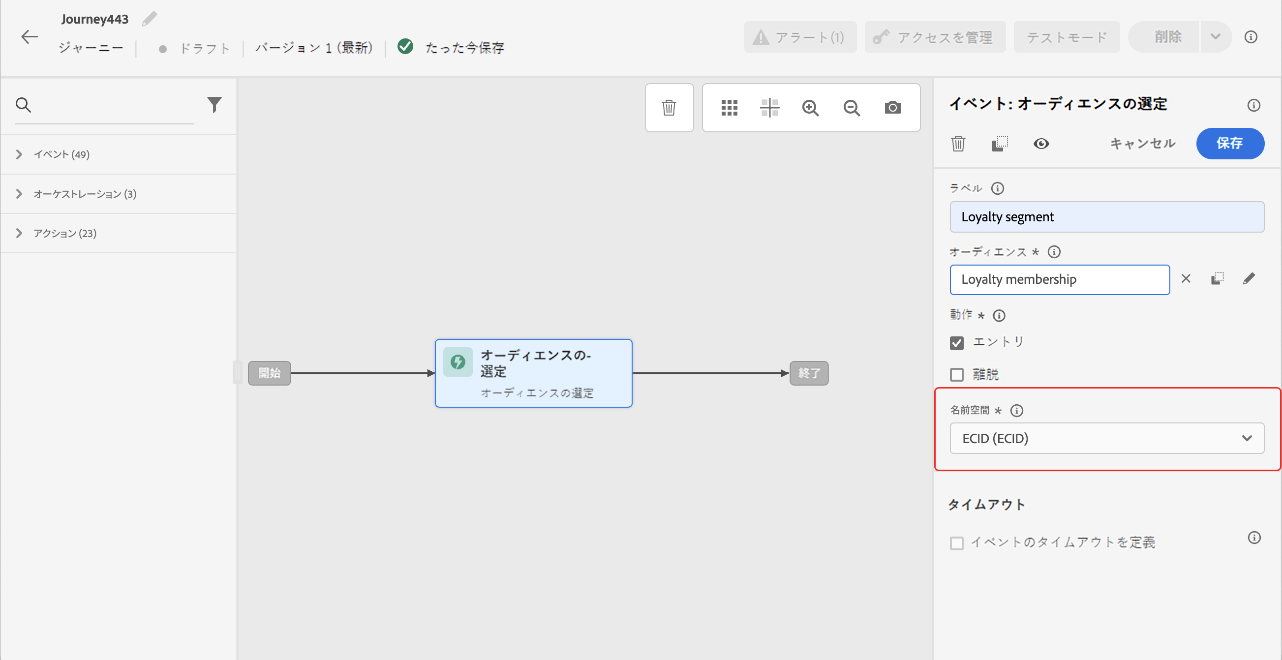名前空間を選択します。これは、イベントがジャーニーの最初のステップとして位置付けられている場合にのみ必要です。デフォルトでは、このフィールドには、最後に使用した名前空間が事前に入力されています。