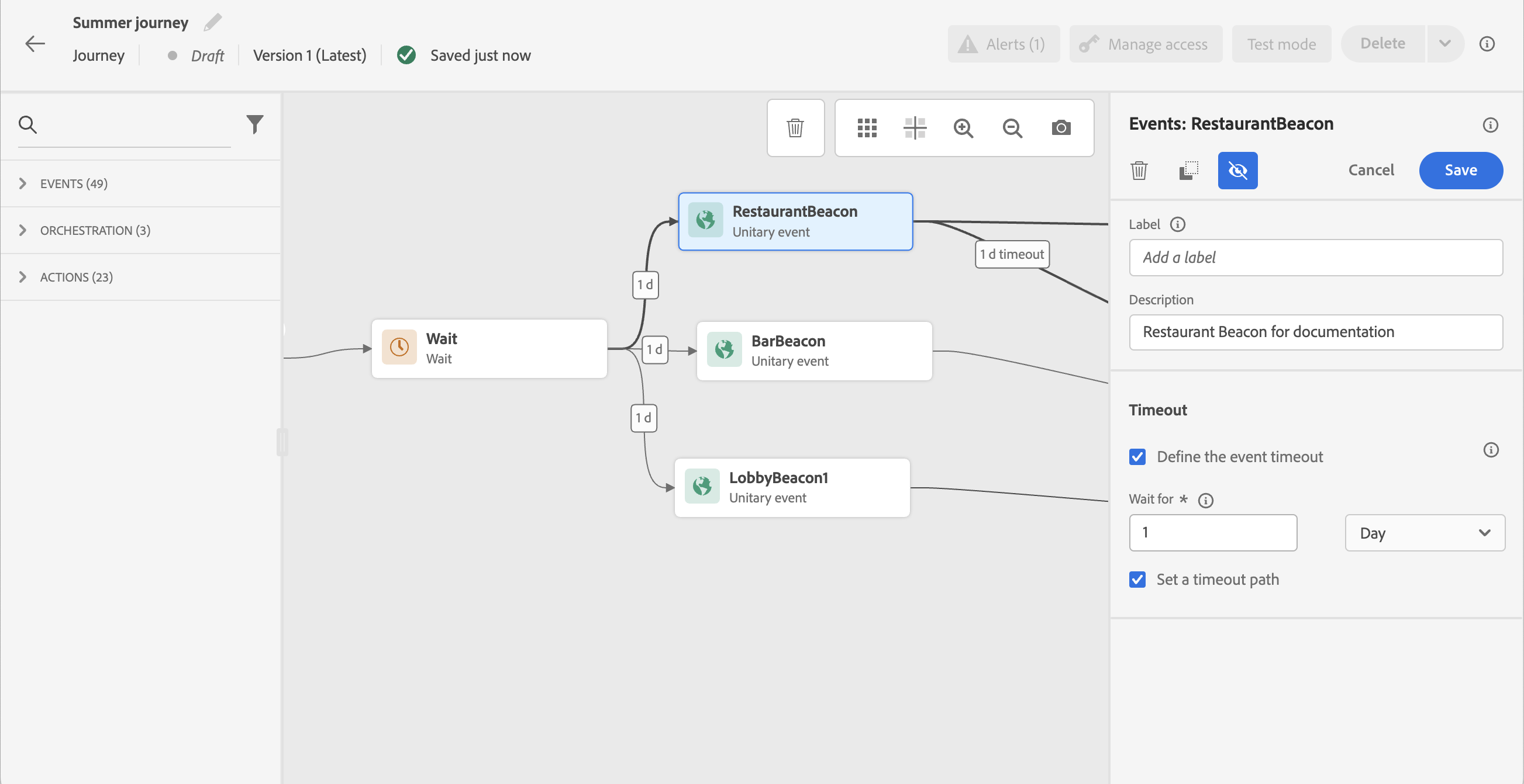 在此範例中,歷程會在客戶進入大廳後,傳送第一封歡迎電子郵件給客戶。 然後,只有在客戶隔天進入餐廳時,才會傳送餐點折扣電子郵件。 因此,我們將餐廳事件設定為1天逾時: