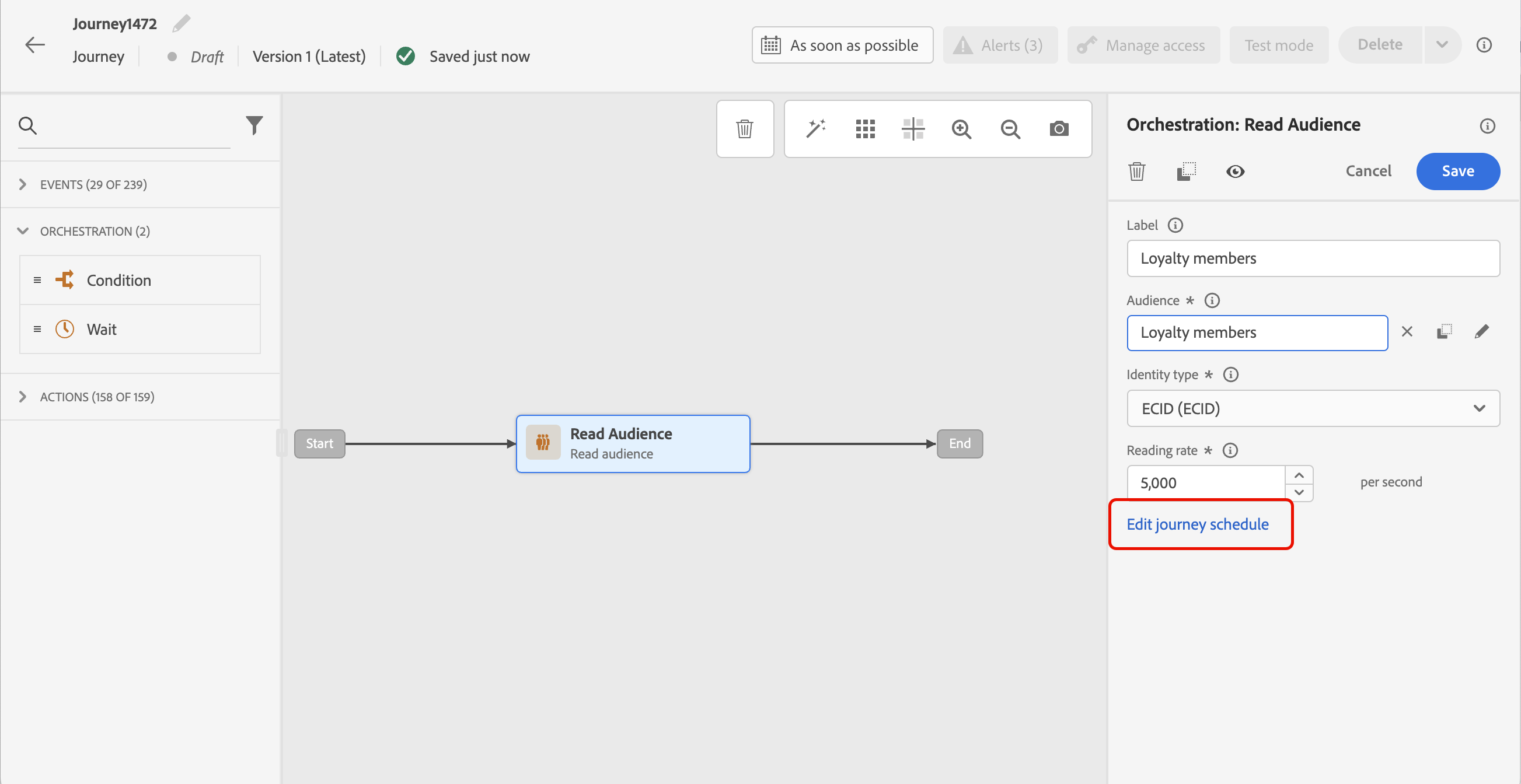 대상자 읽기 활동 속성에서 여정 일정 편집을 선택합니다.