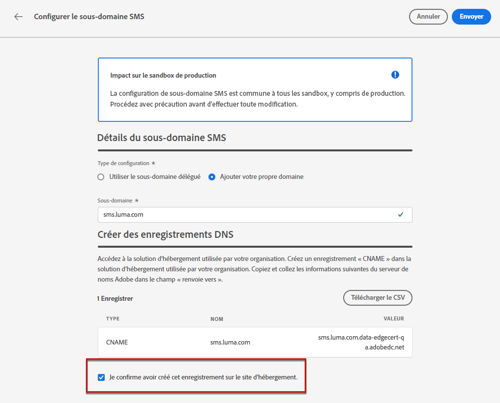 note caution CAUTION Si vous sélectionnez un domaine qui a été délégué à Adobe à l’aide de la méthode CNAME, vous devez créer l’enregistrement DNS sur votre plateforme d’hébergement. Pour générer l’enregistrement DNS, le processus est le même que lorsque vous configurez un nouveau sous-domaine SMS. Découvrez comment dans cette section. -